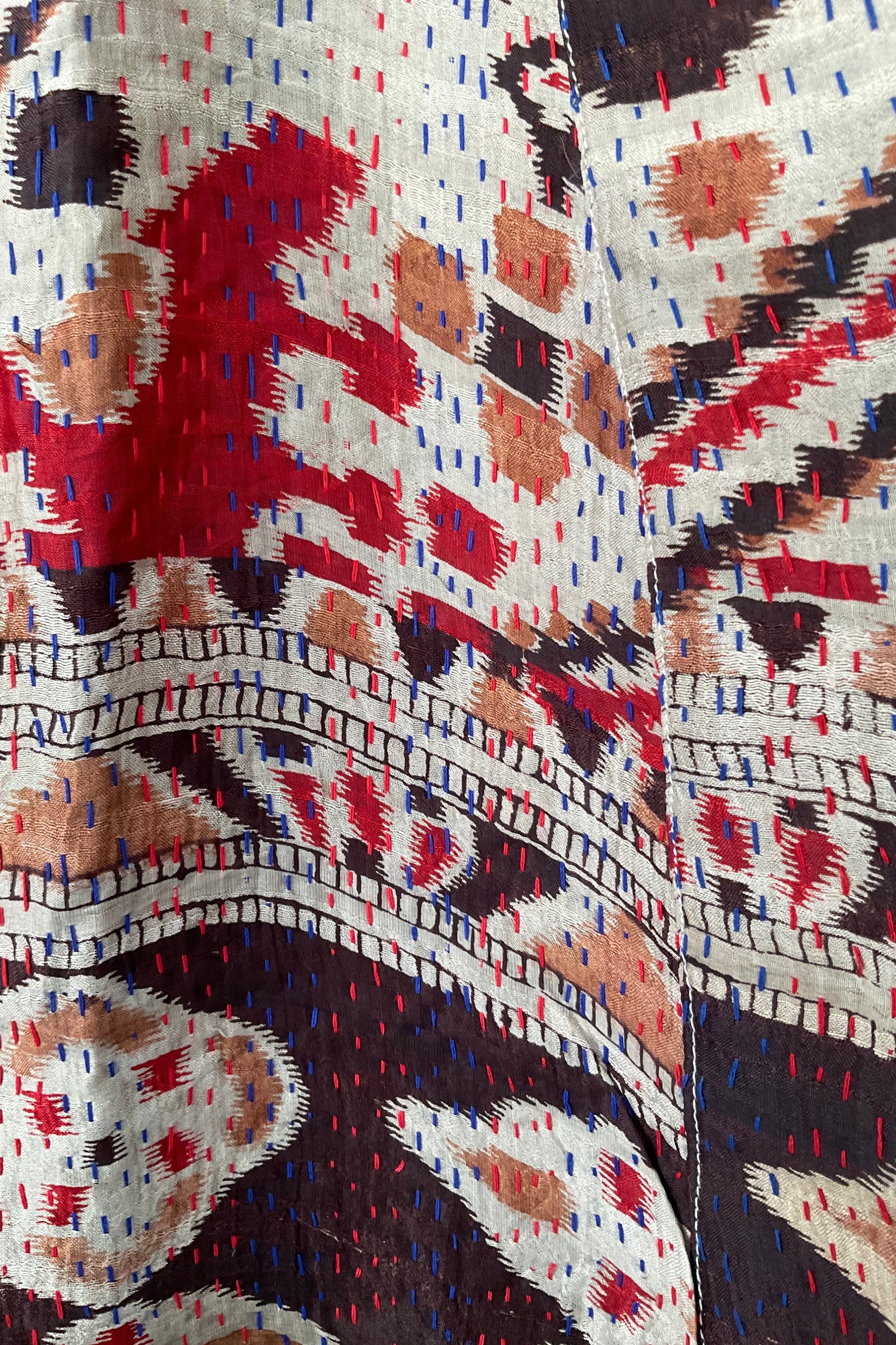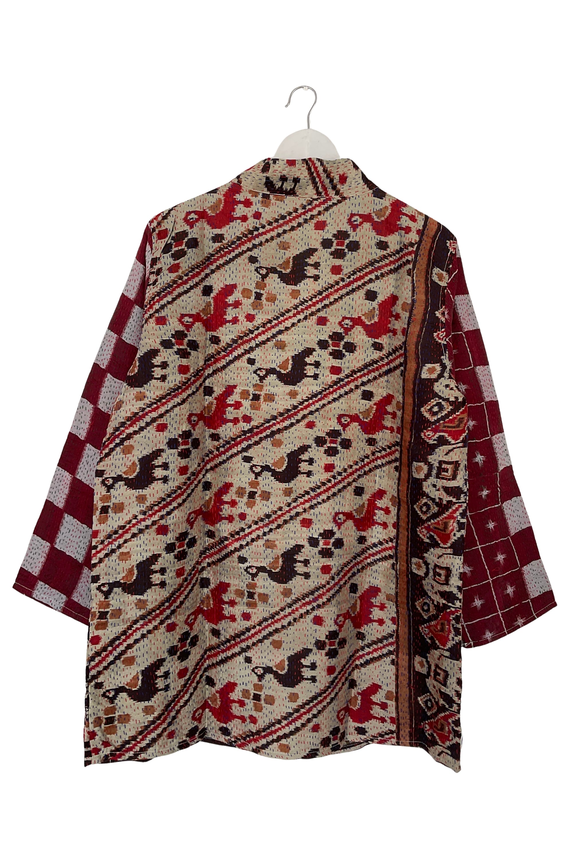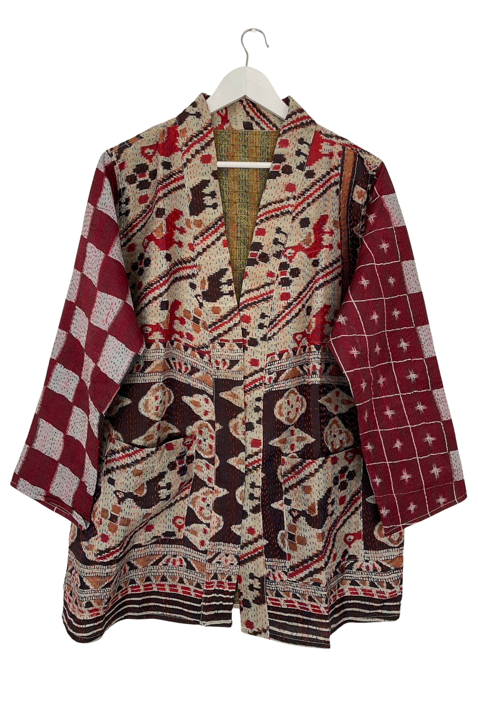 Get ready for a unique piece of wearable art with pieces from our Jodhpur Edit. Our open front Vintage kimono jacket (with pockets) adds both colour and style to your look. Pair it with your jeans or a dress and you're ready for the day! Each piece is unique and handcrafted from vintage silk fabrics that have been stitched together using a running kantha stitch, making it one of a kind.