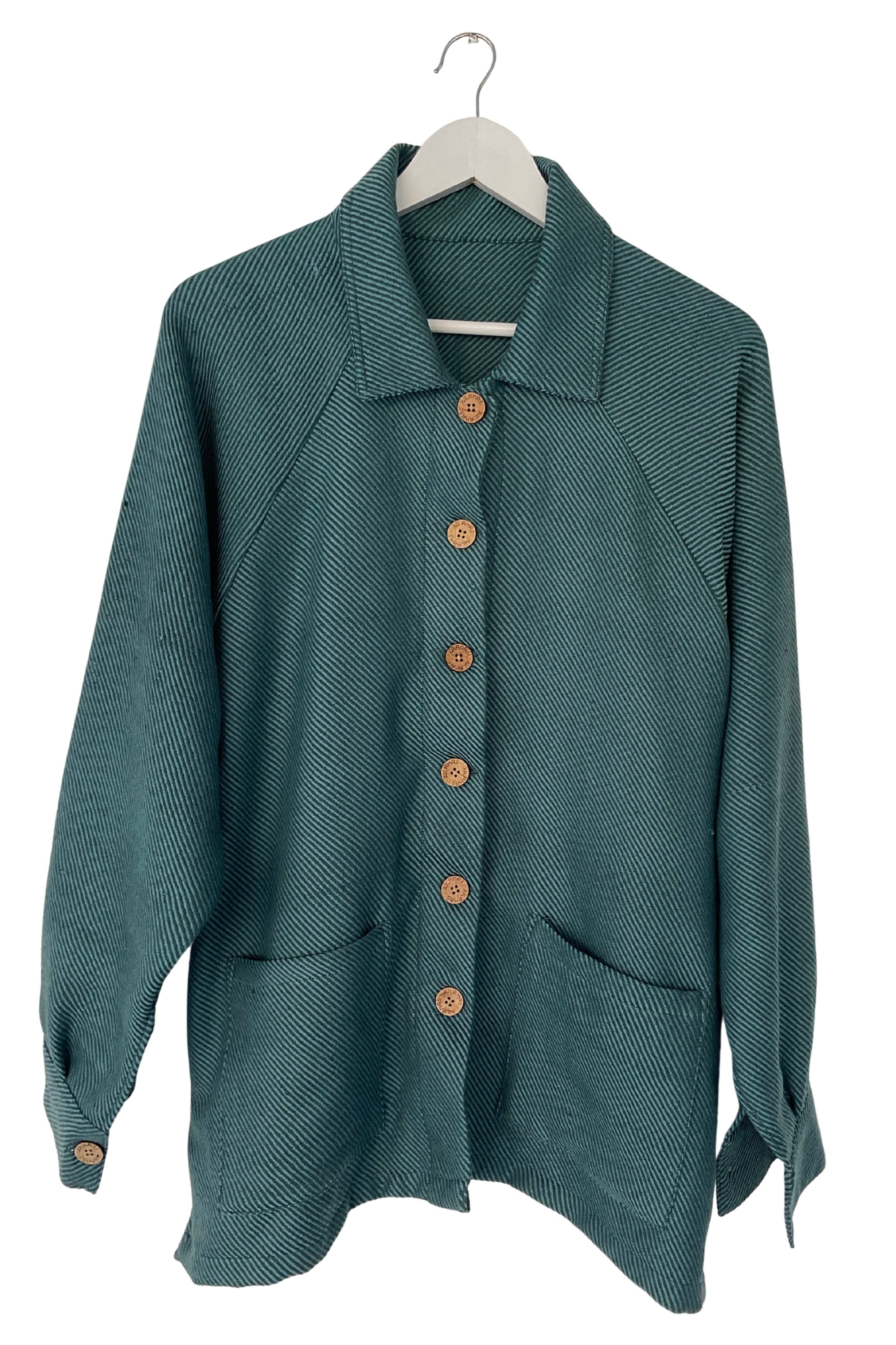 Style meets function in our one-of-a-kind pure wool with raglan sleeves. Warm, stylish and sustainable, it's guaranteed to keep you cosy and chic. A stylish and comfortable layering jacket with a buttoned front, collars, cuffs and pockets this one size shacket fits up to size 1XL (see sizing for more details) and can be styled with a dress, or over pants and a vest.