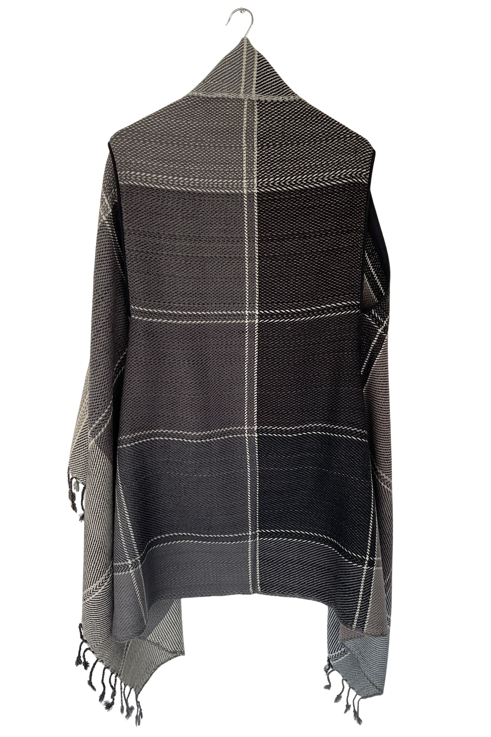 Handwoven in remote Indian villages by women artisans using 100% wool, this cape is made through a zero-waste process where free-size slit armholes allow multiple styling options.