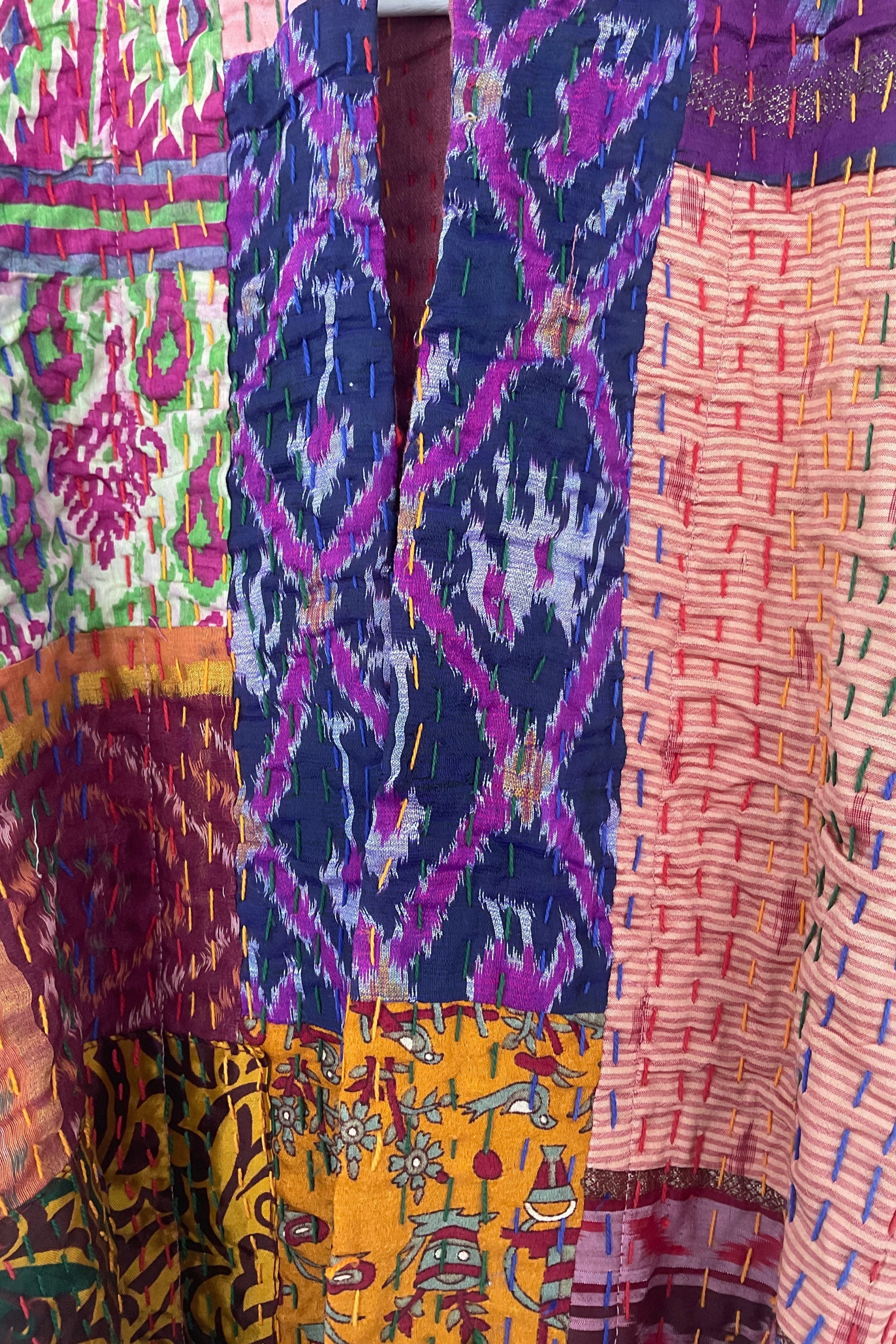 The VINTAGE PATCHWORK OVERLAY is a wearable canvas of color, texture, and tradition. Handcrafted by women artisans of Bengal using the kantha technique, in which the fabric is made from vibrant vintage sarees, uniquely patched together and detailed with fine running stitches.
