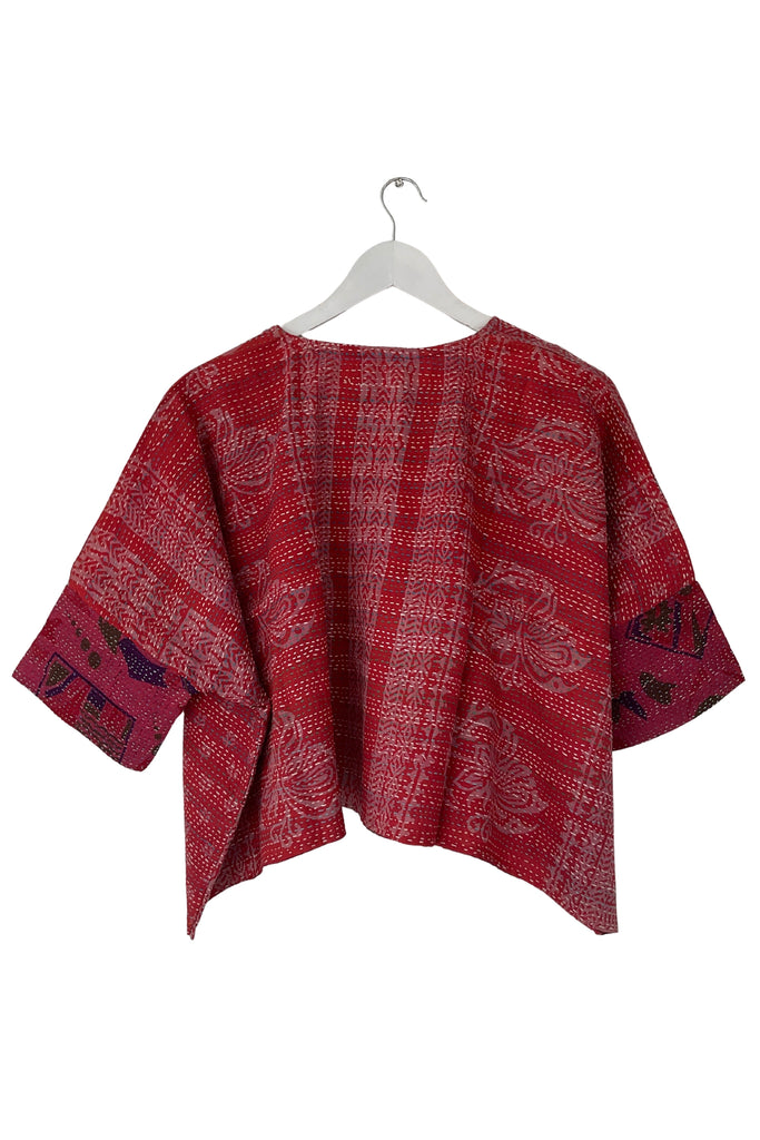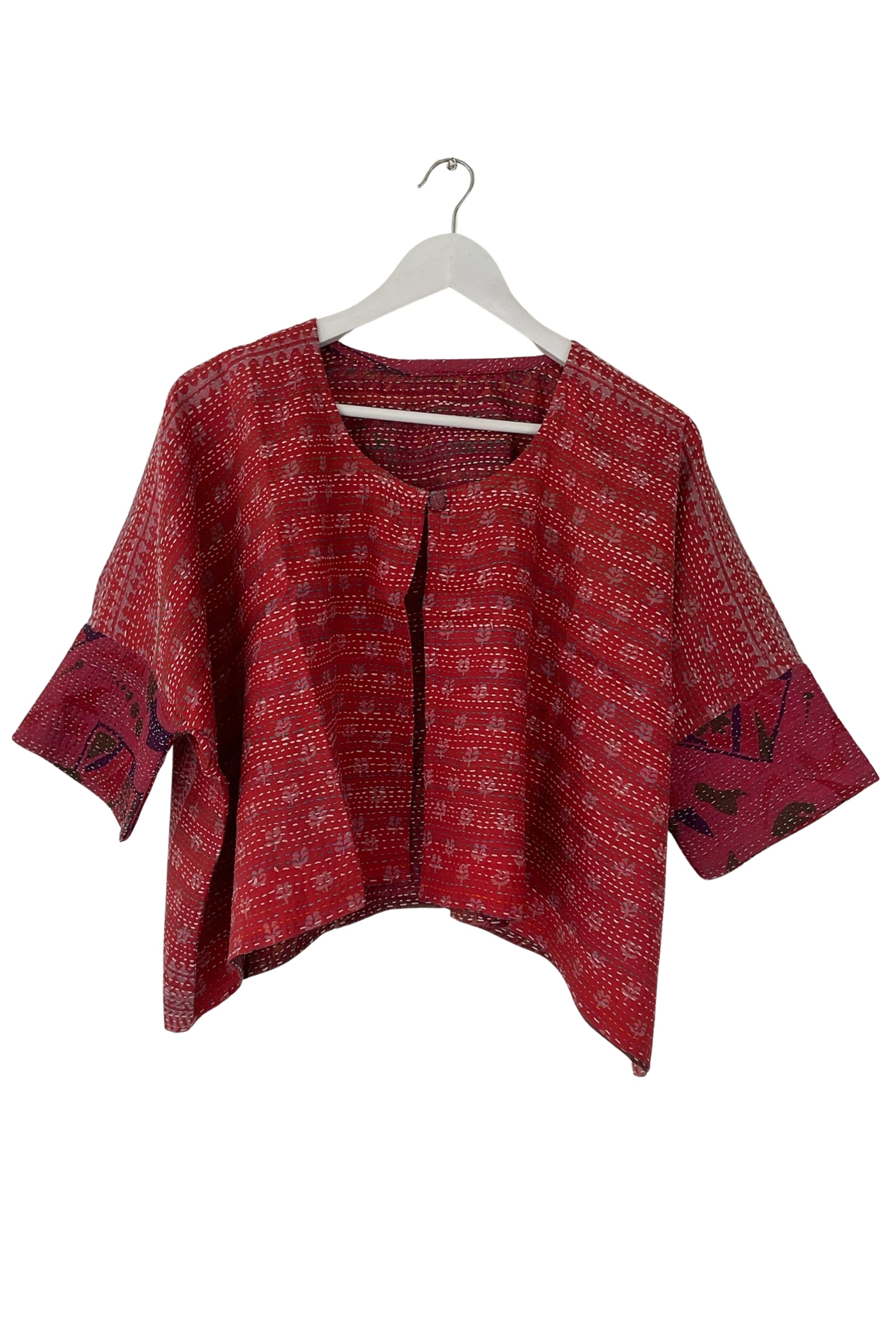Designed as a one-size-fits-all piece with elbow-length fitted sleeves, it features an open front, a single-button closure for versatile styling. Fair Trade Certified, this free-size overlay embodies the beauty of reuse and the timeless artistry of kantha craft.