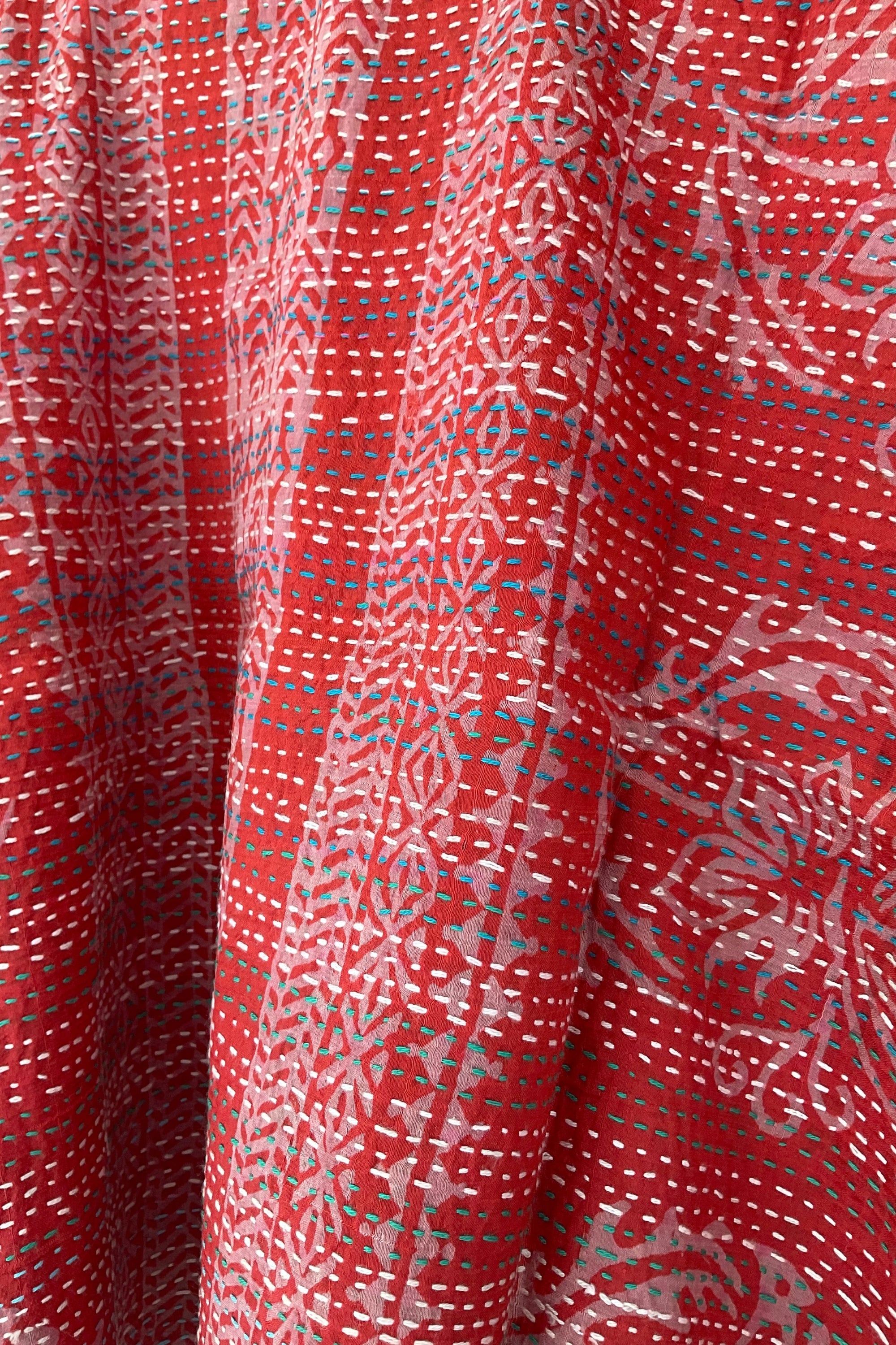 The Vintage Stories Top is a wearable canvas of color, texture, and tradition. Handcrafted by women artisans of Bengal using the kantha technique, the fabric is made from vibrant vintage sarees, uniquely patched together and detailed with fine running stitches. Kantha, a centuries-old embroidery tradition from Bengal, uses delicate, rhythmic stitching to transform old fabrics into something new and full of life.