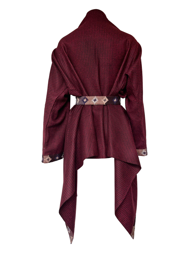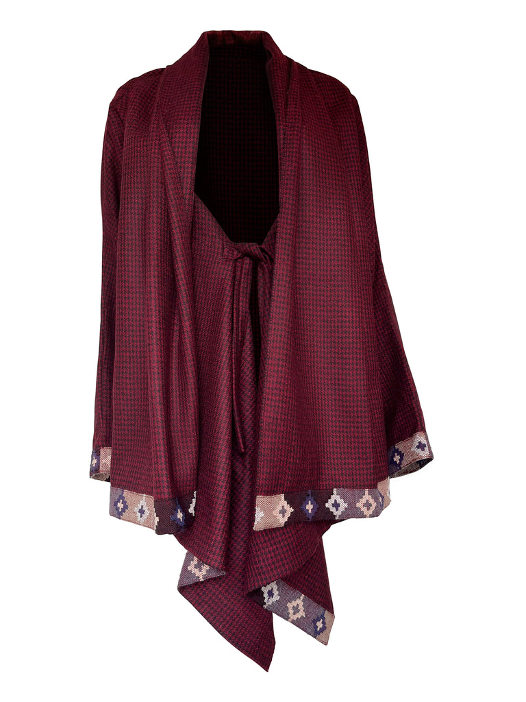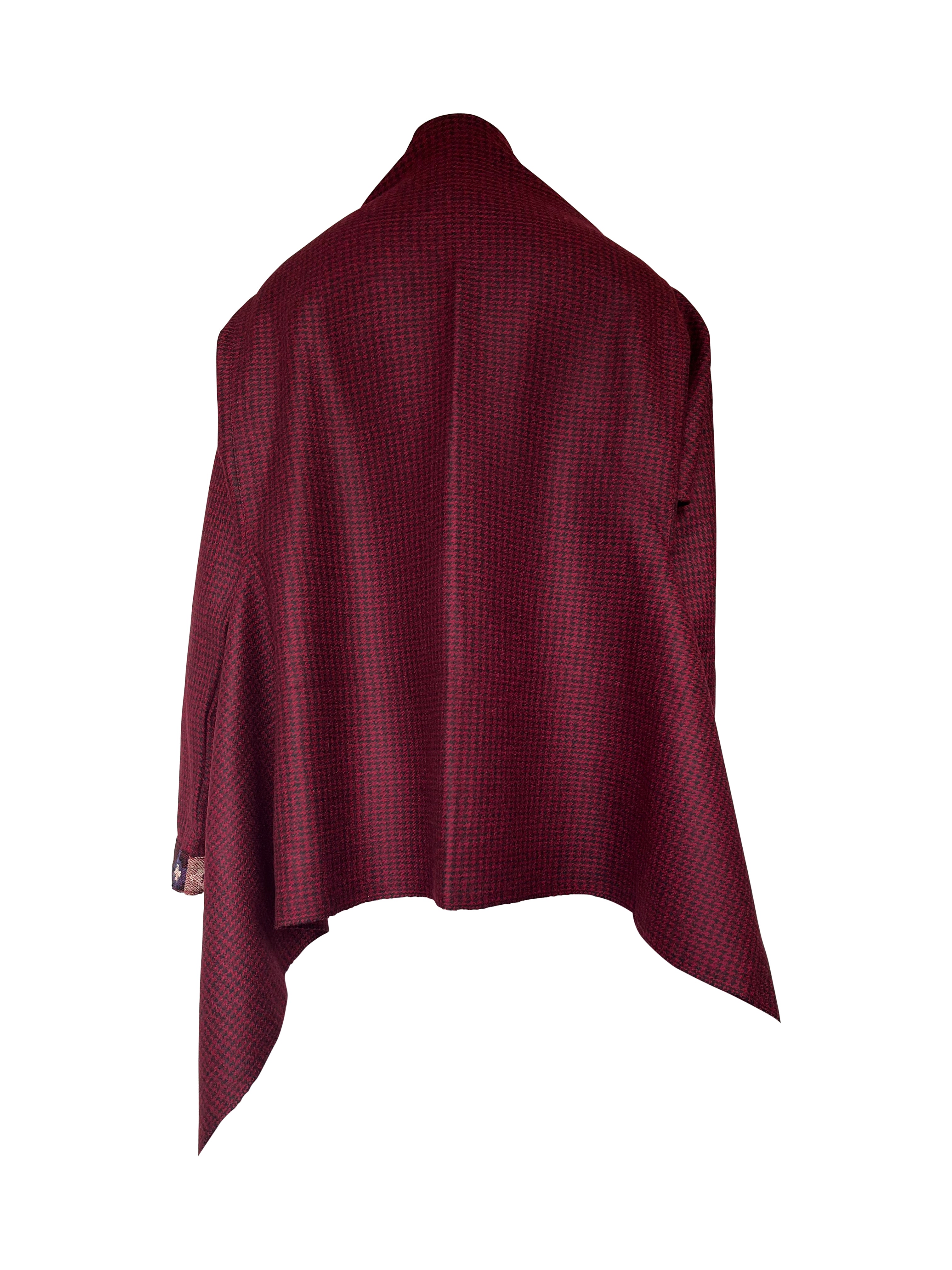 The Wool Cape Coat Cocoon Maroon blends luxury with comfort. Handcrafted from 100% Woolmark-certified mid-weight wool, it keeps you snug while offering endless versatility, wear it long, open, wrapped, or belted for multiple looks. A subtle houndstooth weave adds depth and texture.