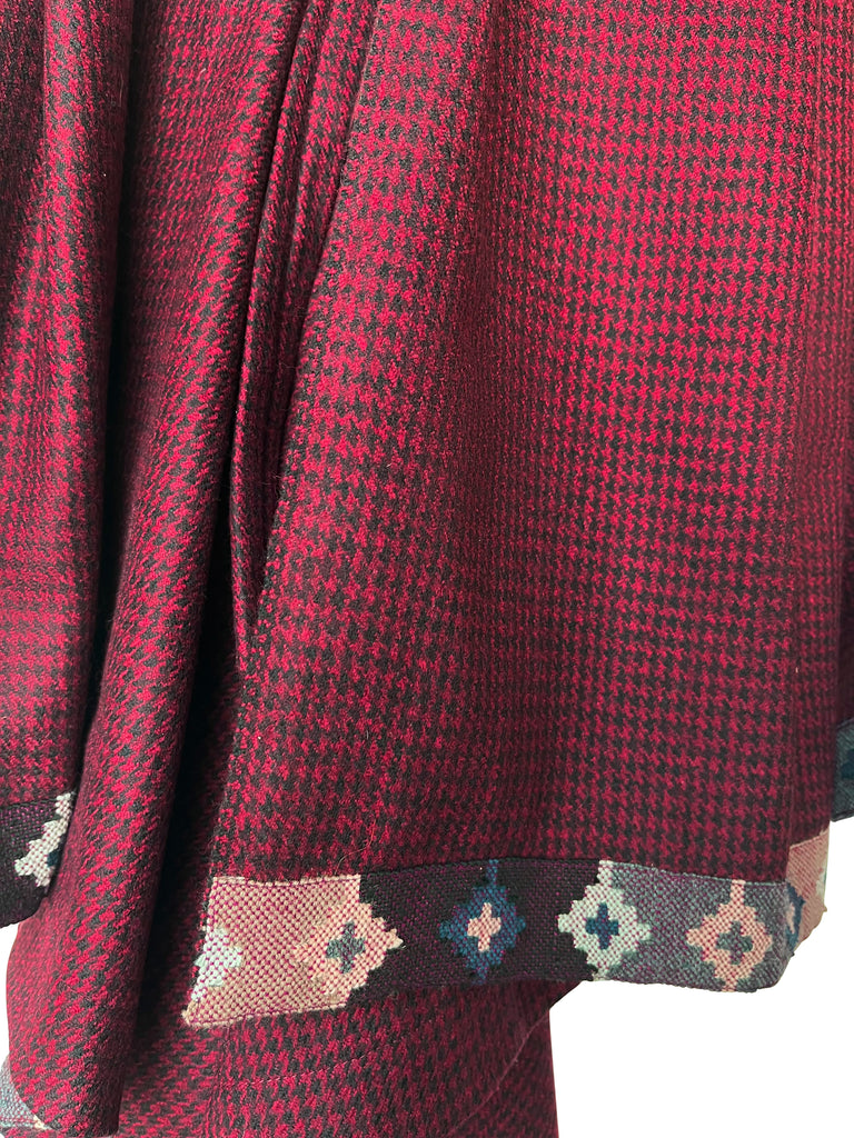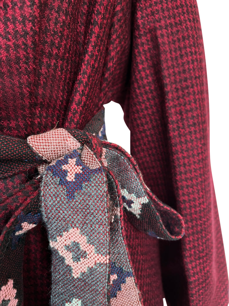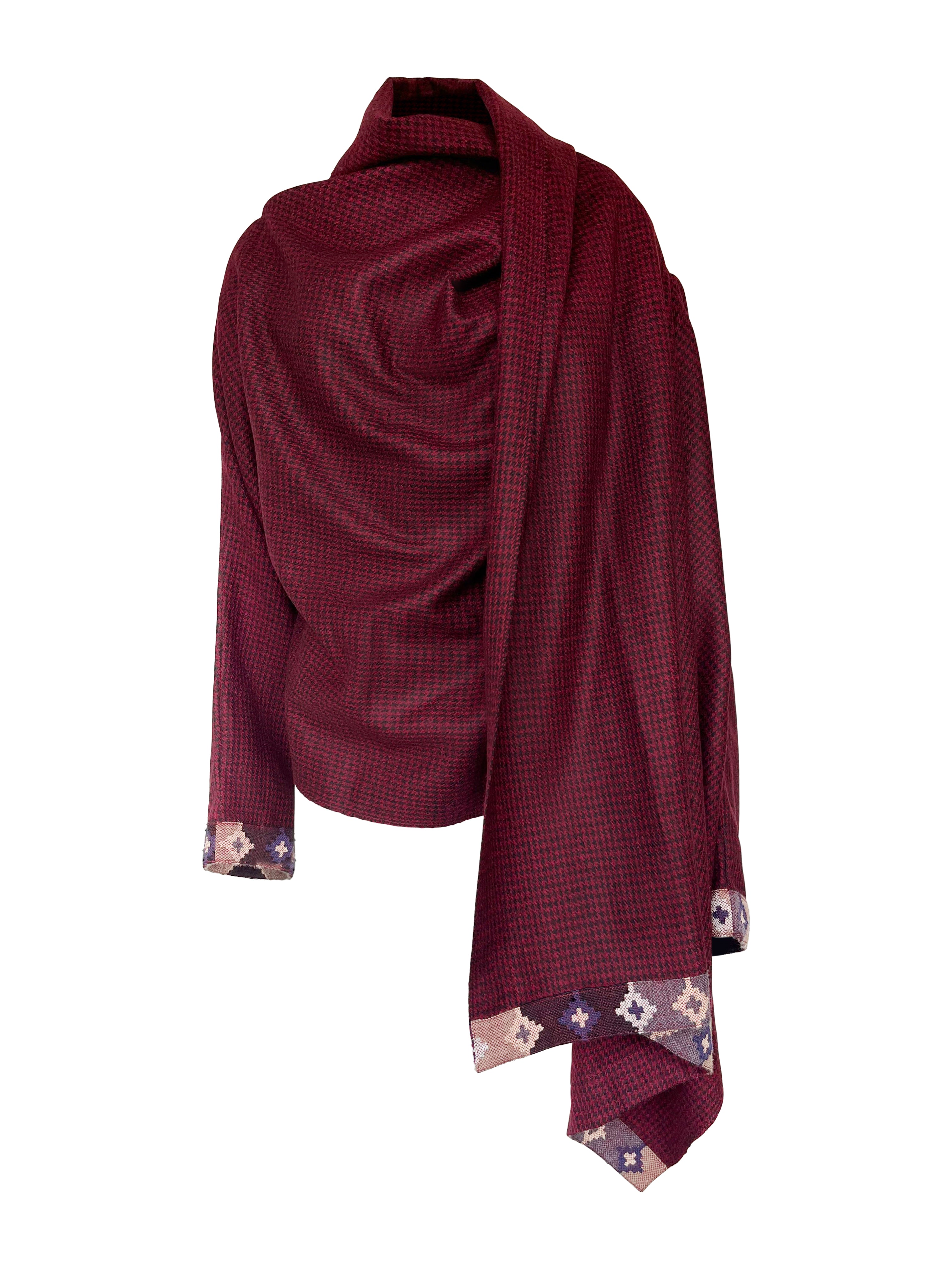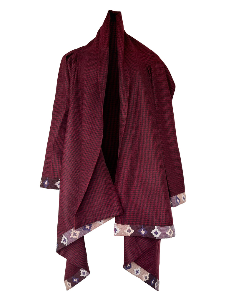The Wool Cape Coat Cocoon Maroon blends luxury with comfort. Handcrafted from 100% Woolmark-certified mid-weight wool, it keeps you snug while offering endless versatility, wear it long, open, wrapped, or belted for multiple looks. A subtle houndstooth weave adds depth and texture.