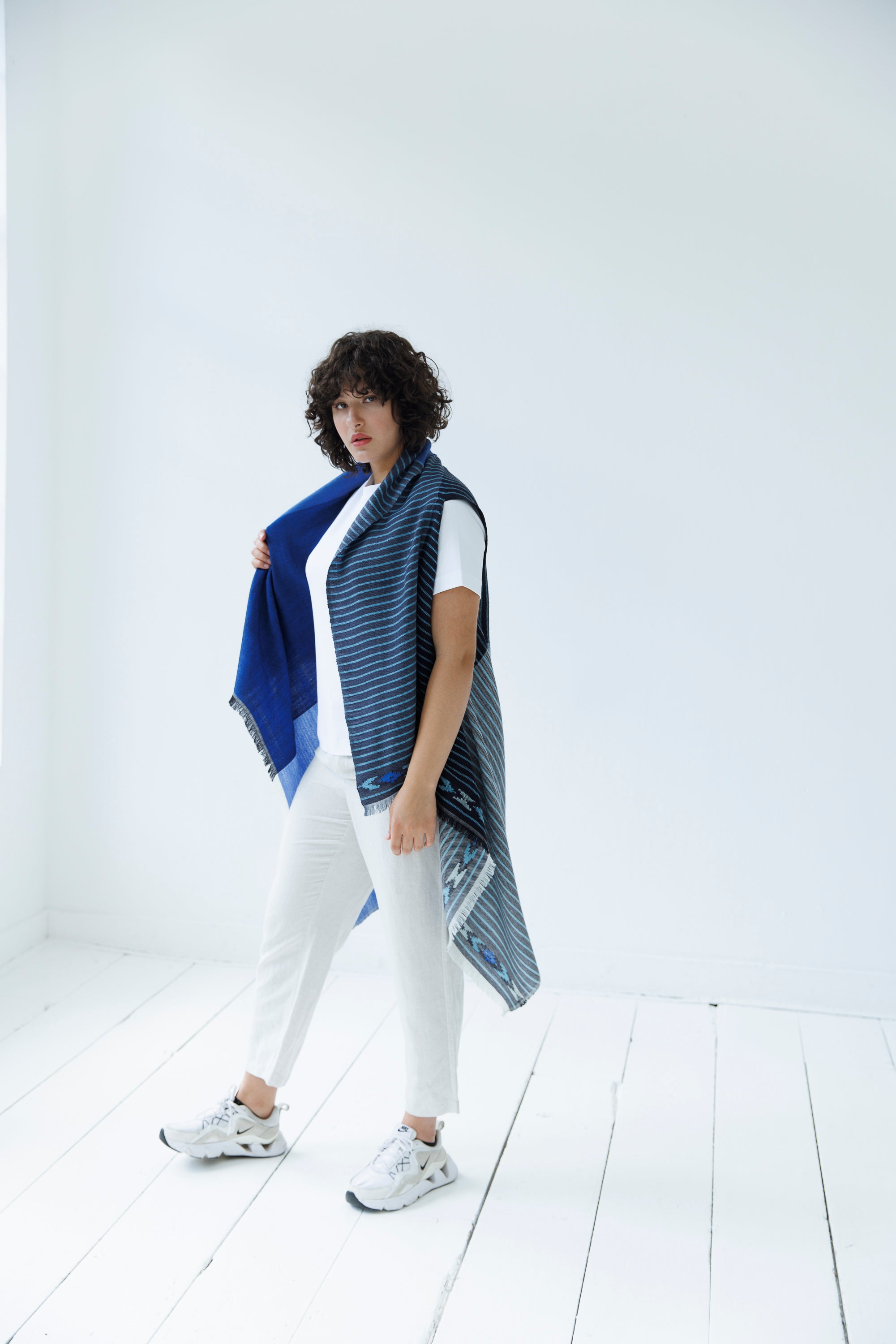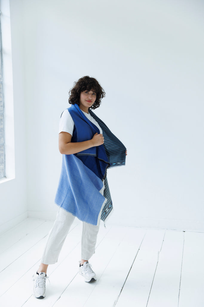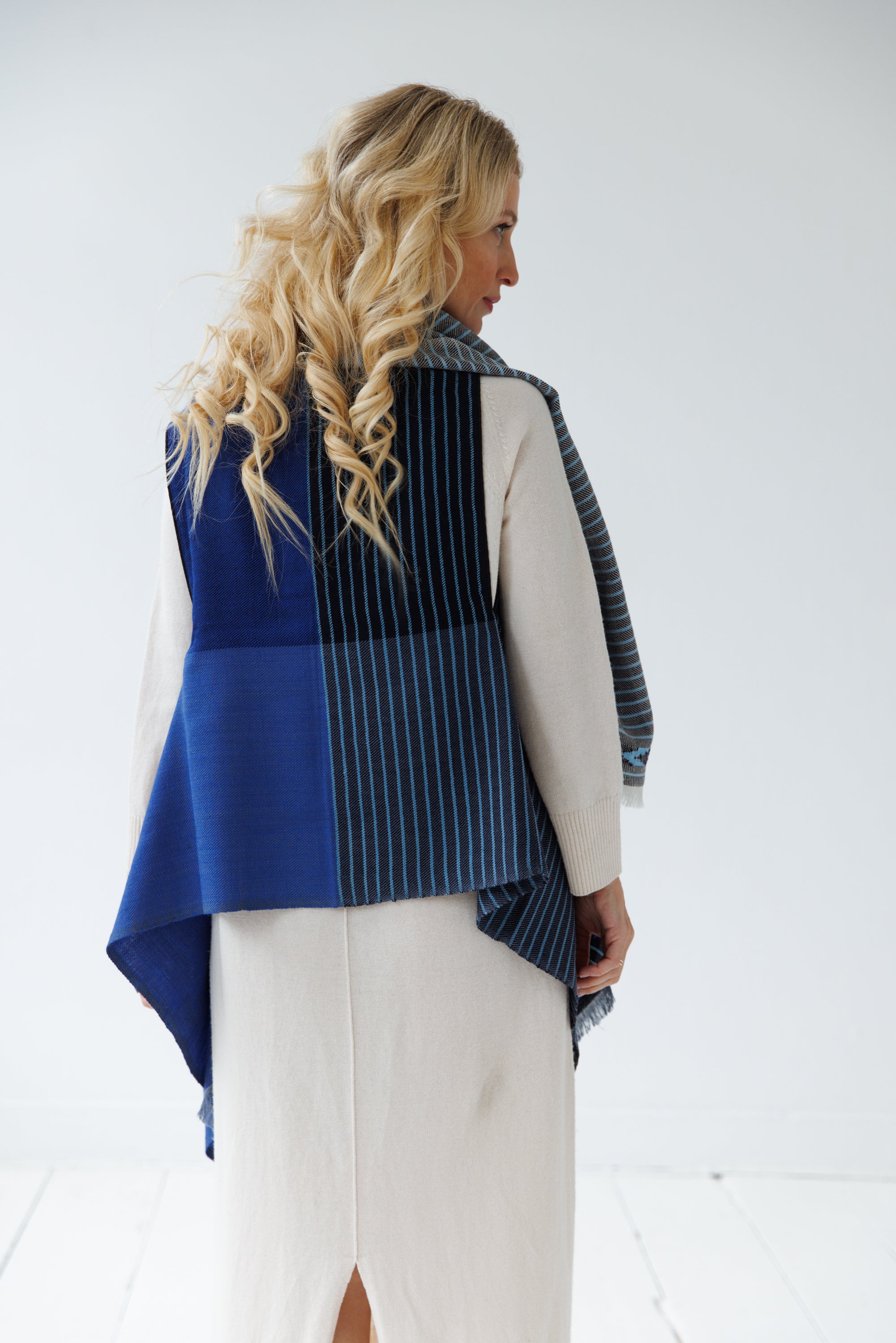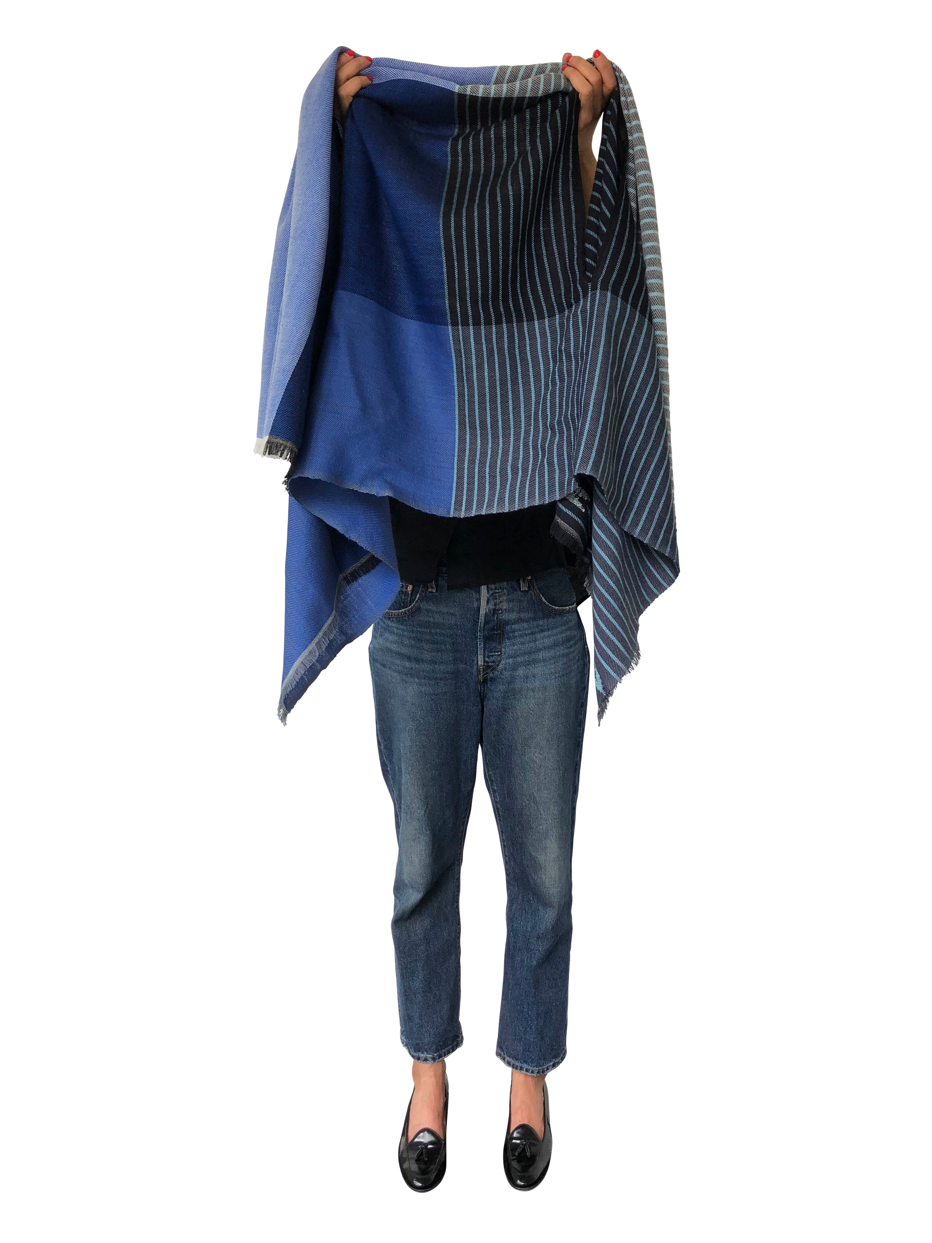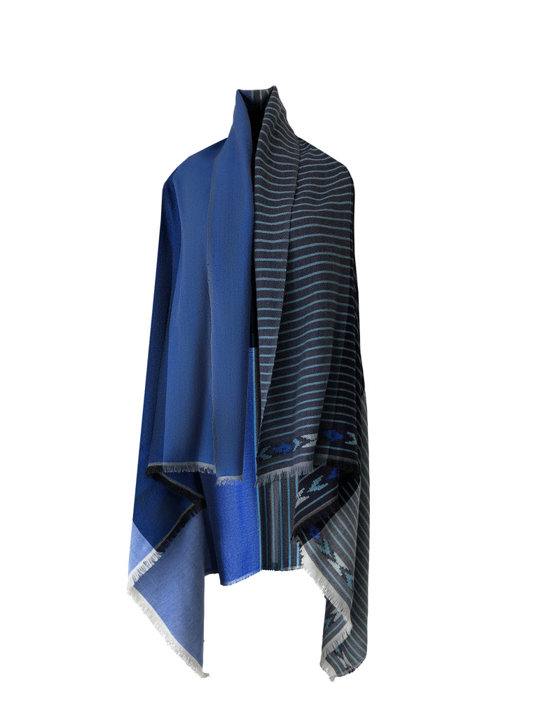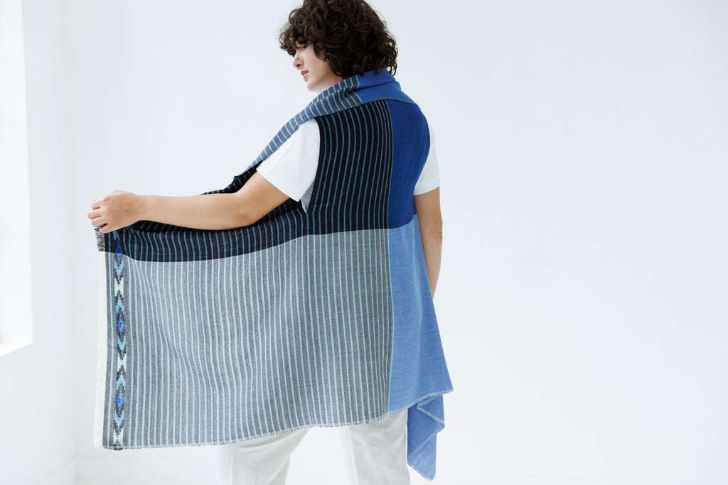 Colour-blocks meet fine wool in the Cape Fusion Blue, a 15-in-one versatile piece that blends geometric patterns with traditional craft. Handwoven from 100% wool, it offers warmth year-round yet stays light enough to carry in your bag.