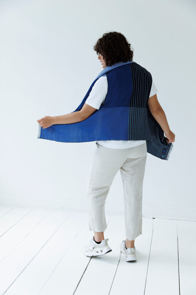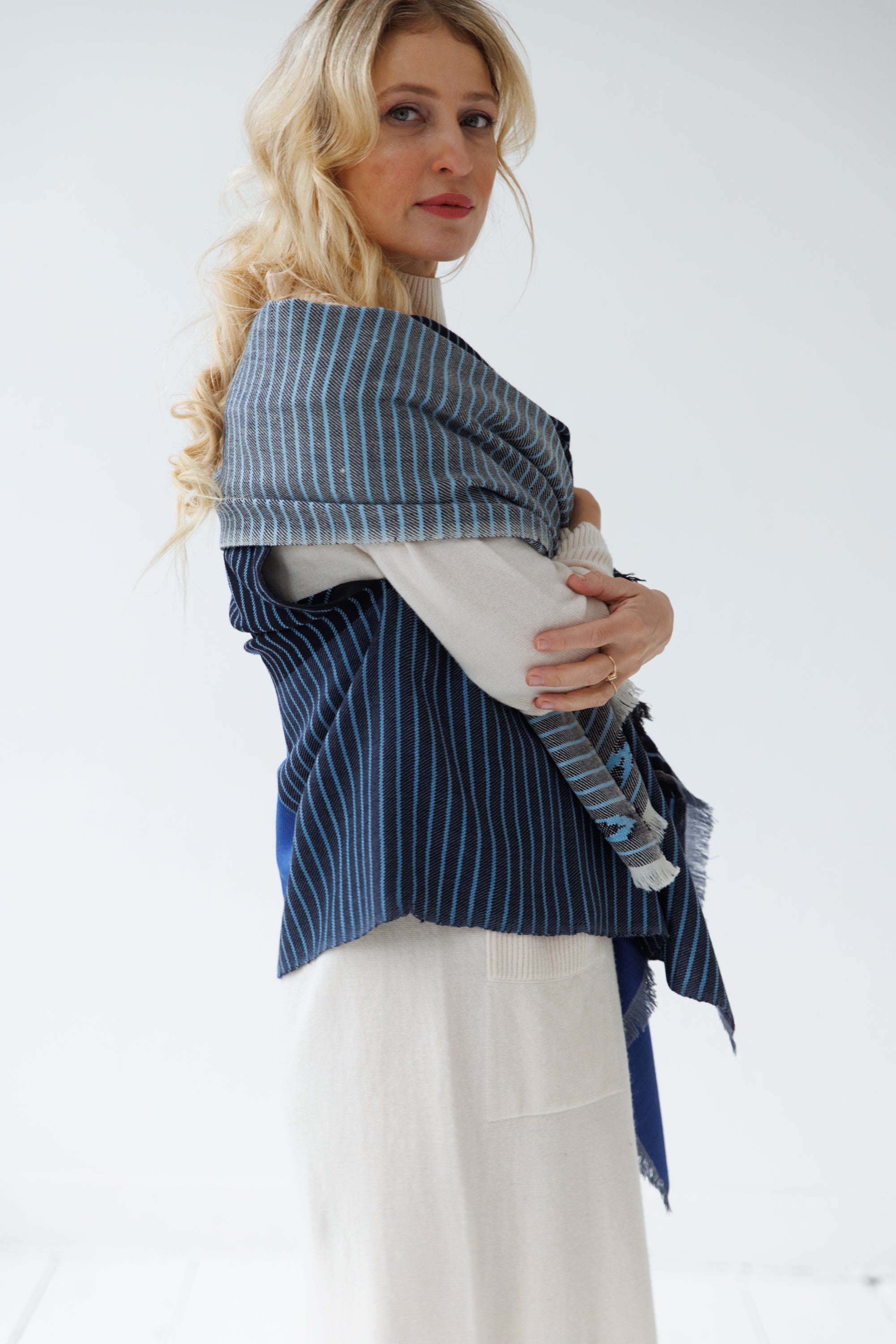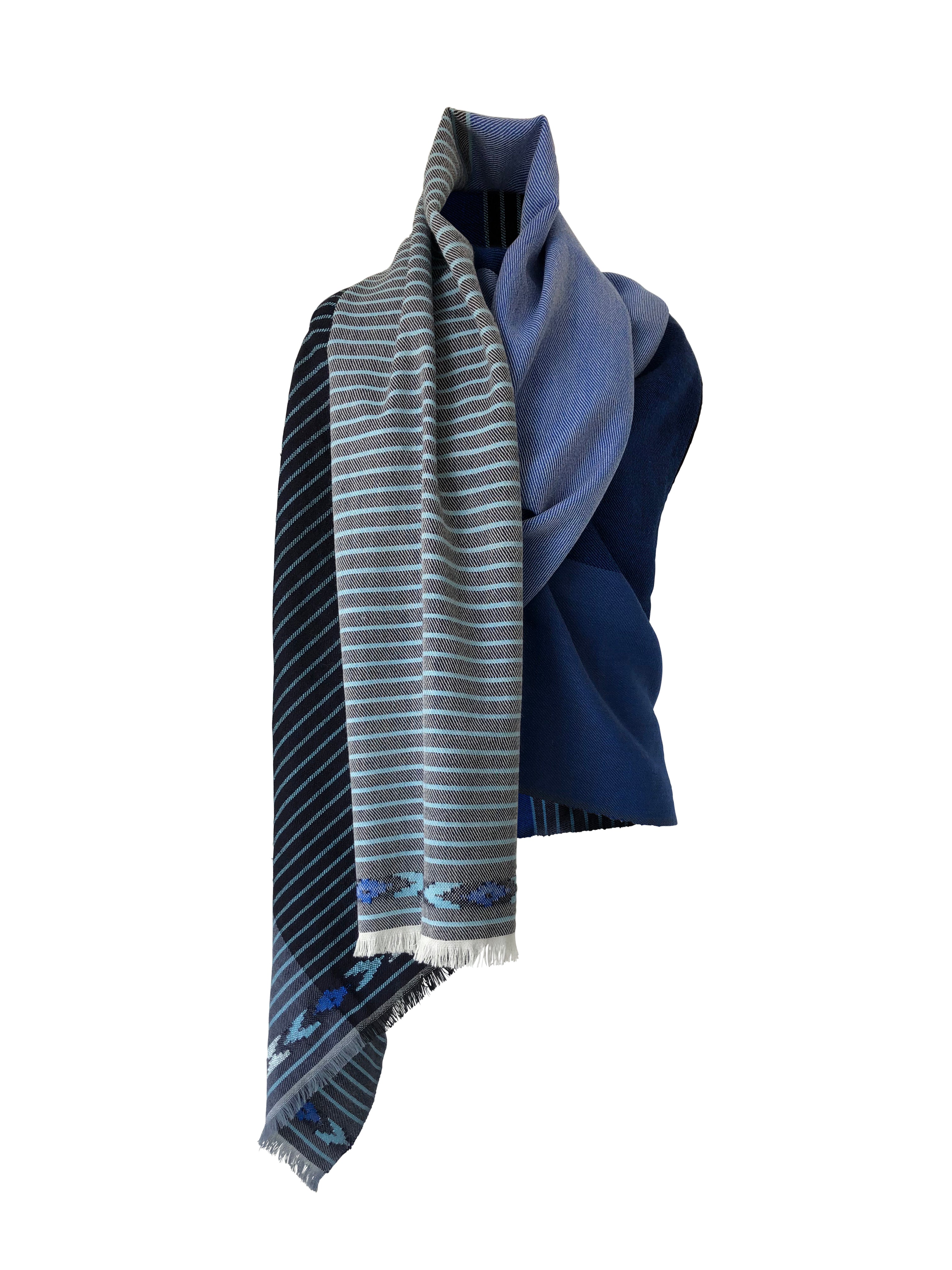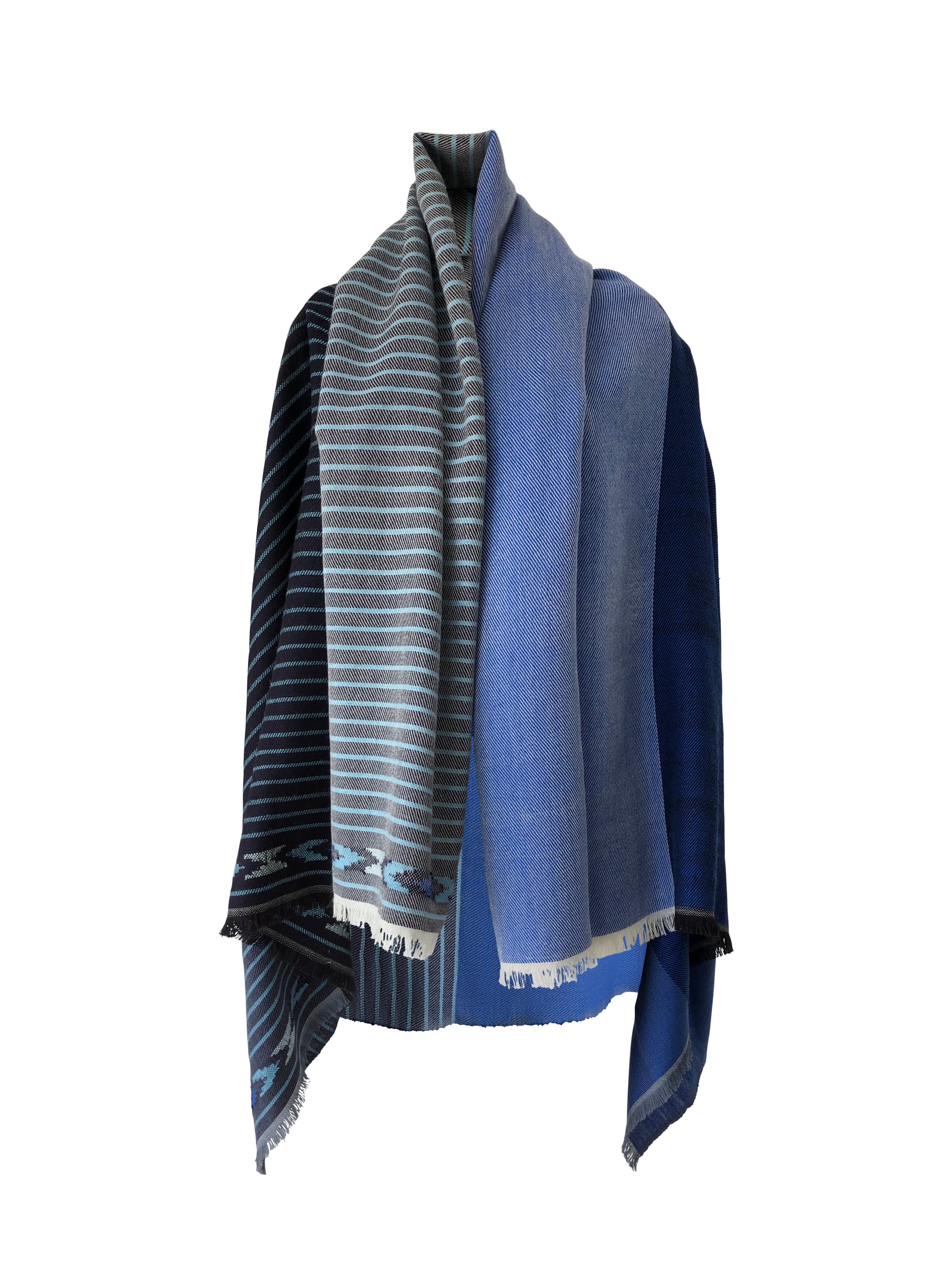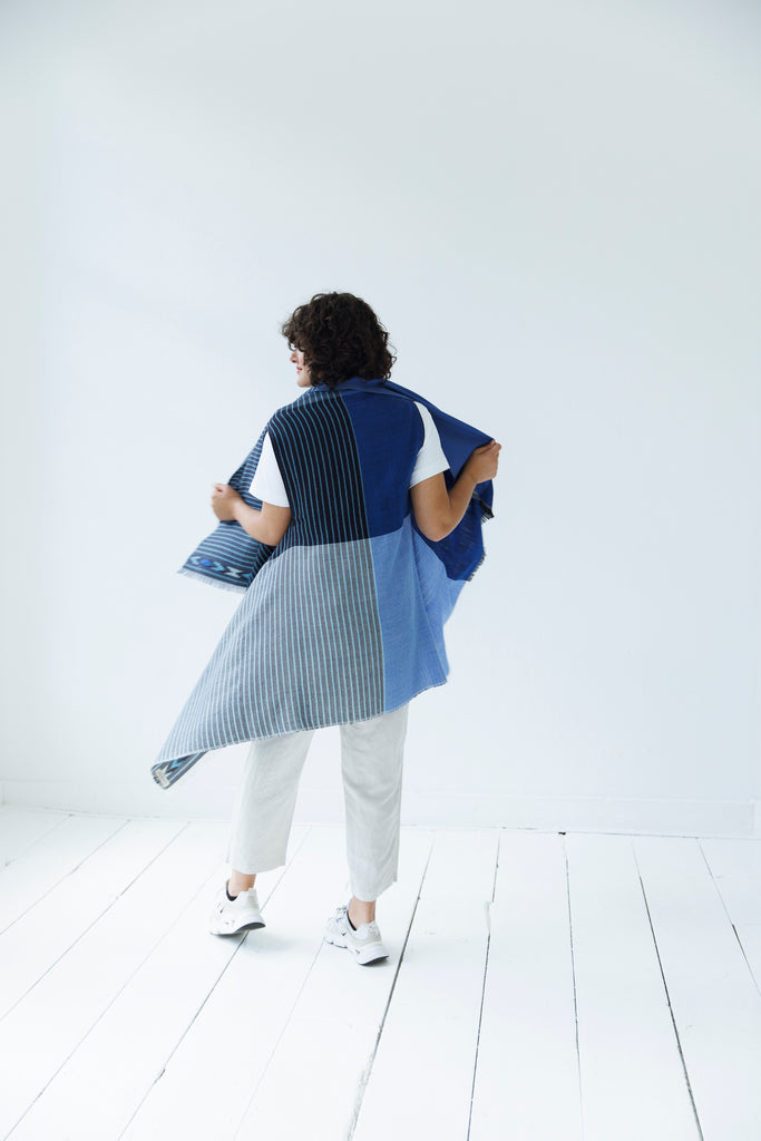 Colour-blocks meet fine wool in the Cape Fusion Blue, a 15-in-one versatile piece that blends geometric patterns with traditional craft. Handwoven from 100% wool, it offers warmth year-round yet stays light enough to carry in your bag.