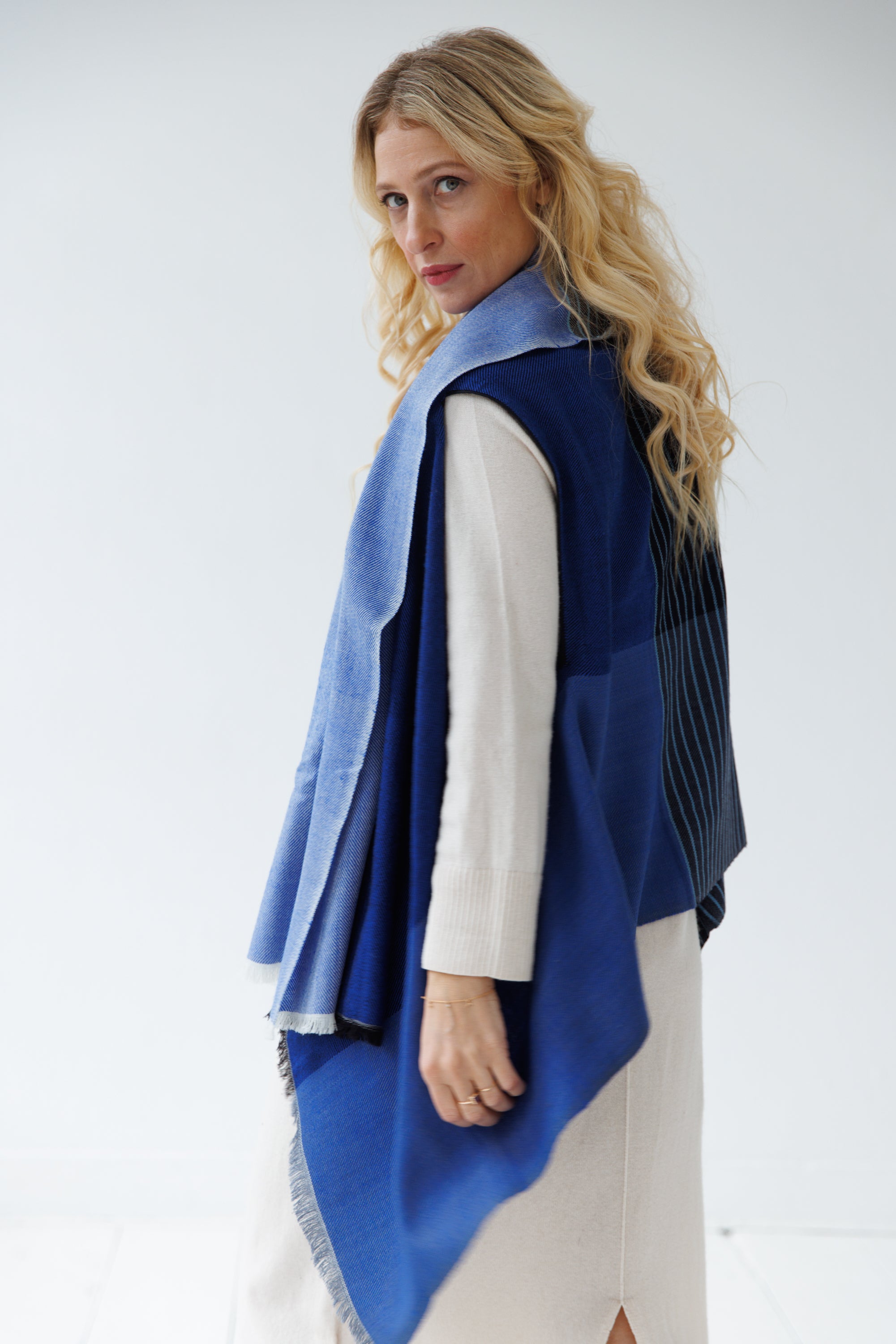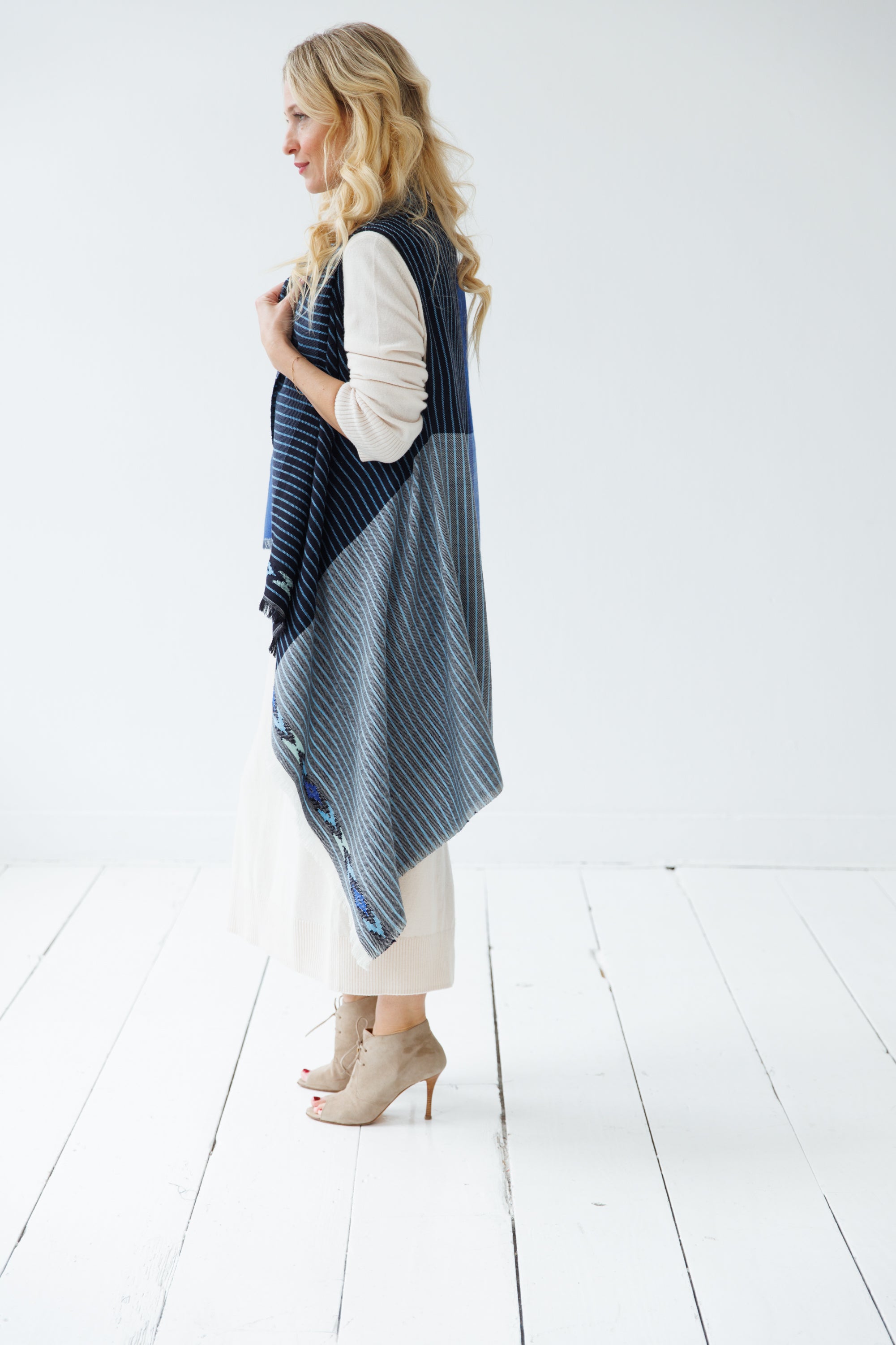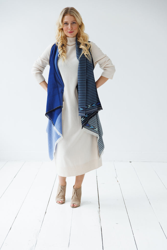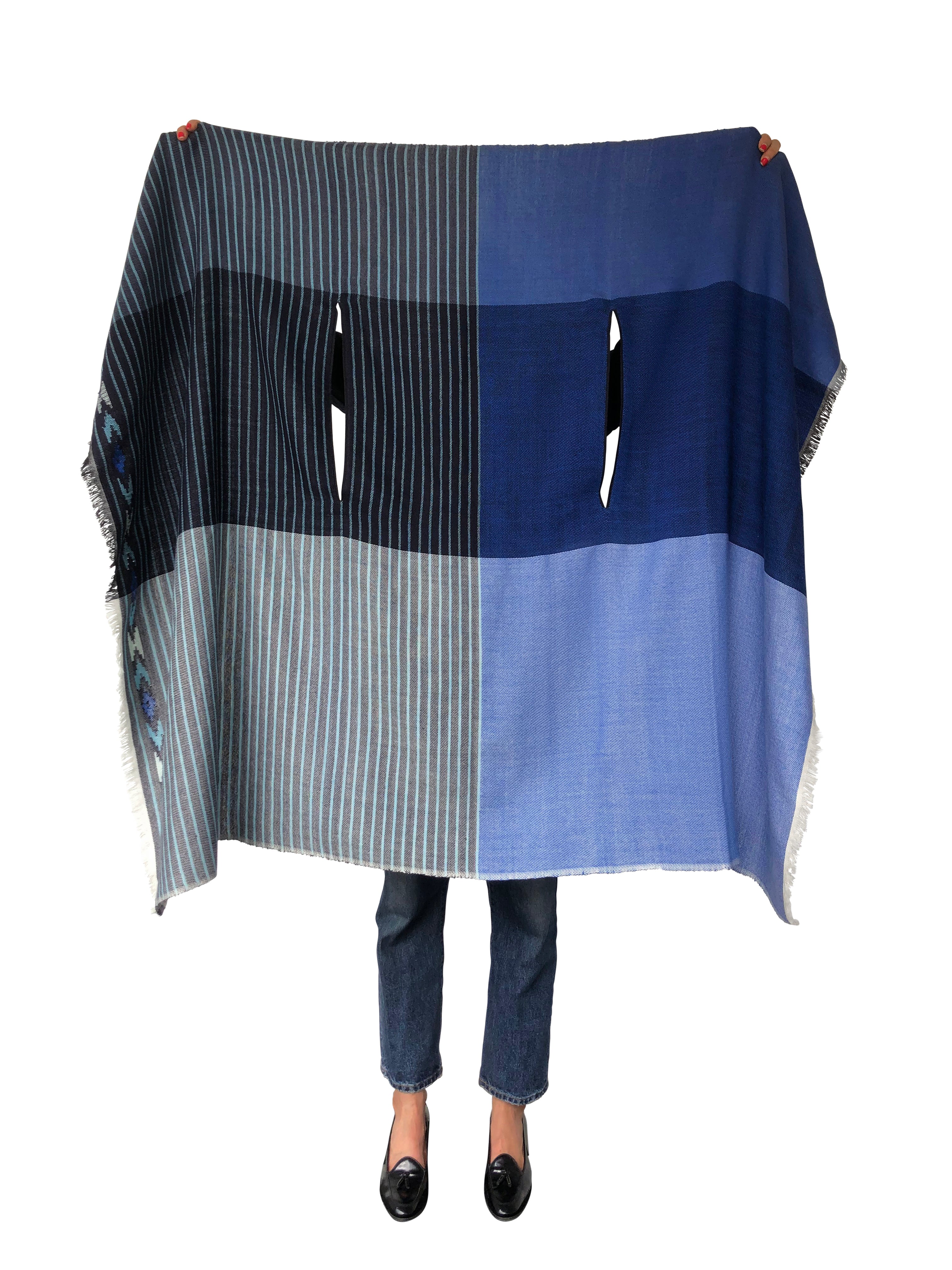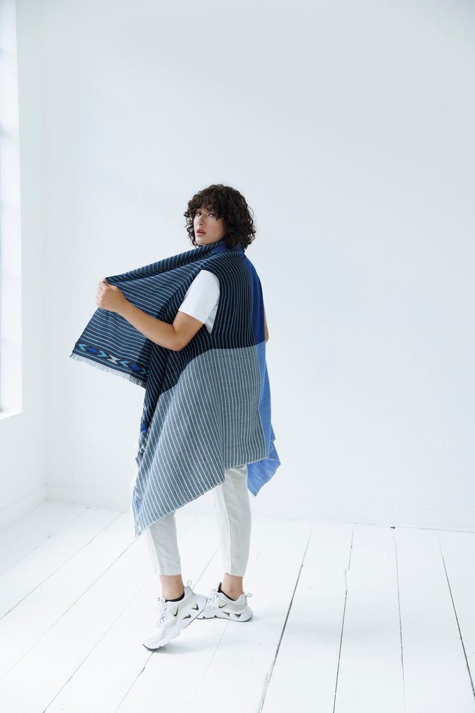 Designed in Amsterdam and handcrafted in the Himalayas, its clever armhole placement allows endless styling — long as a poncho, short like a scarf, or belted as a dress.