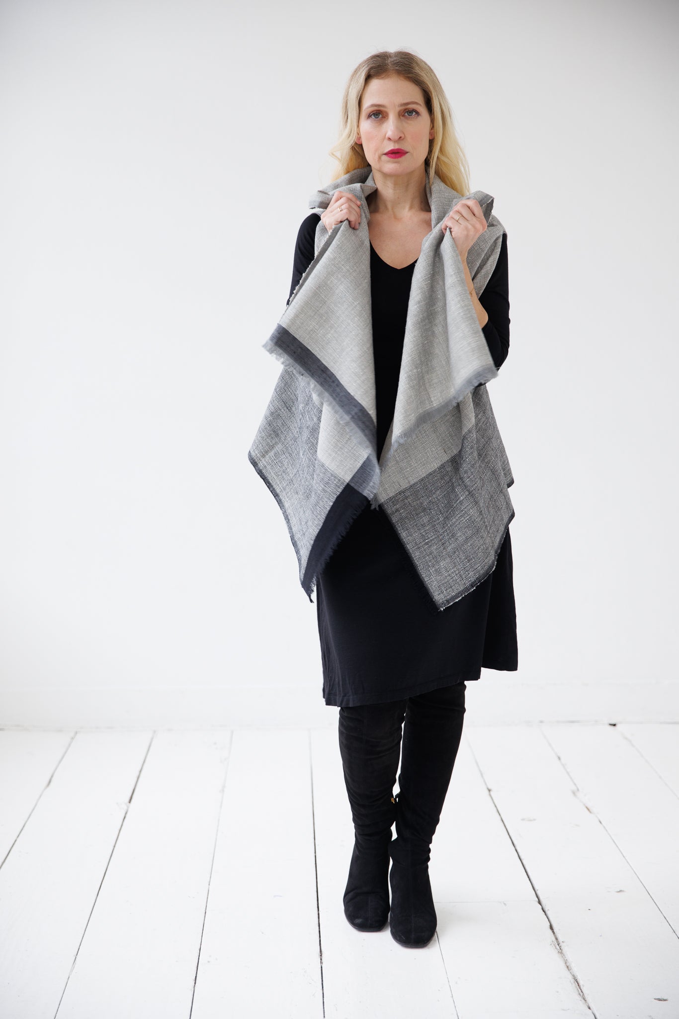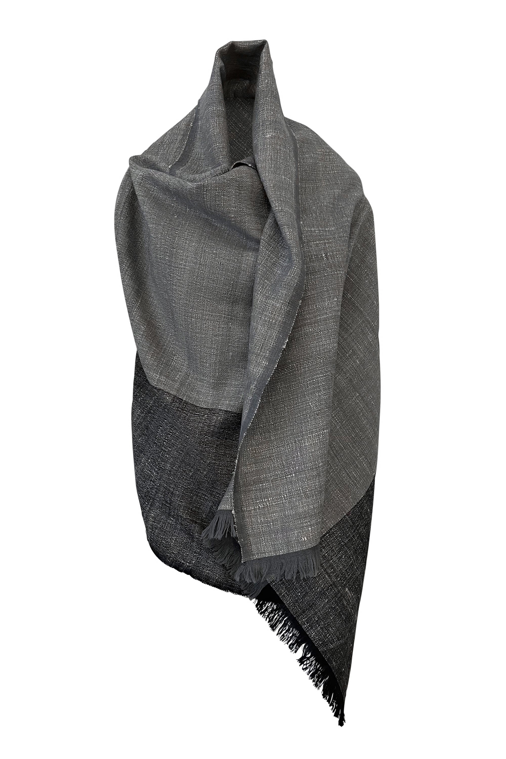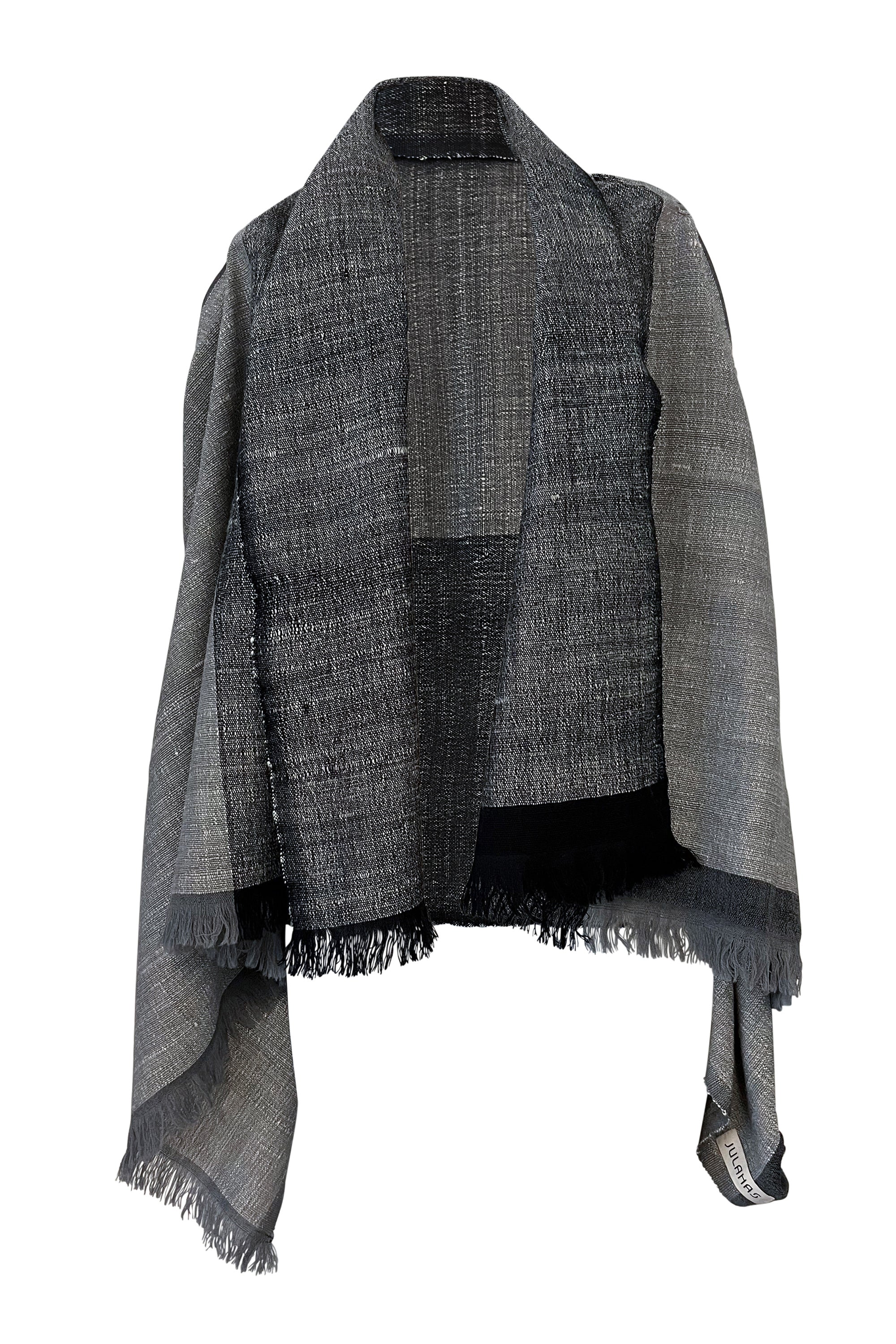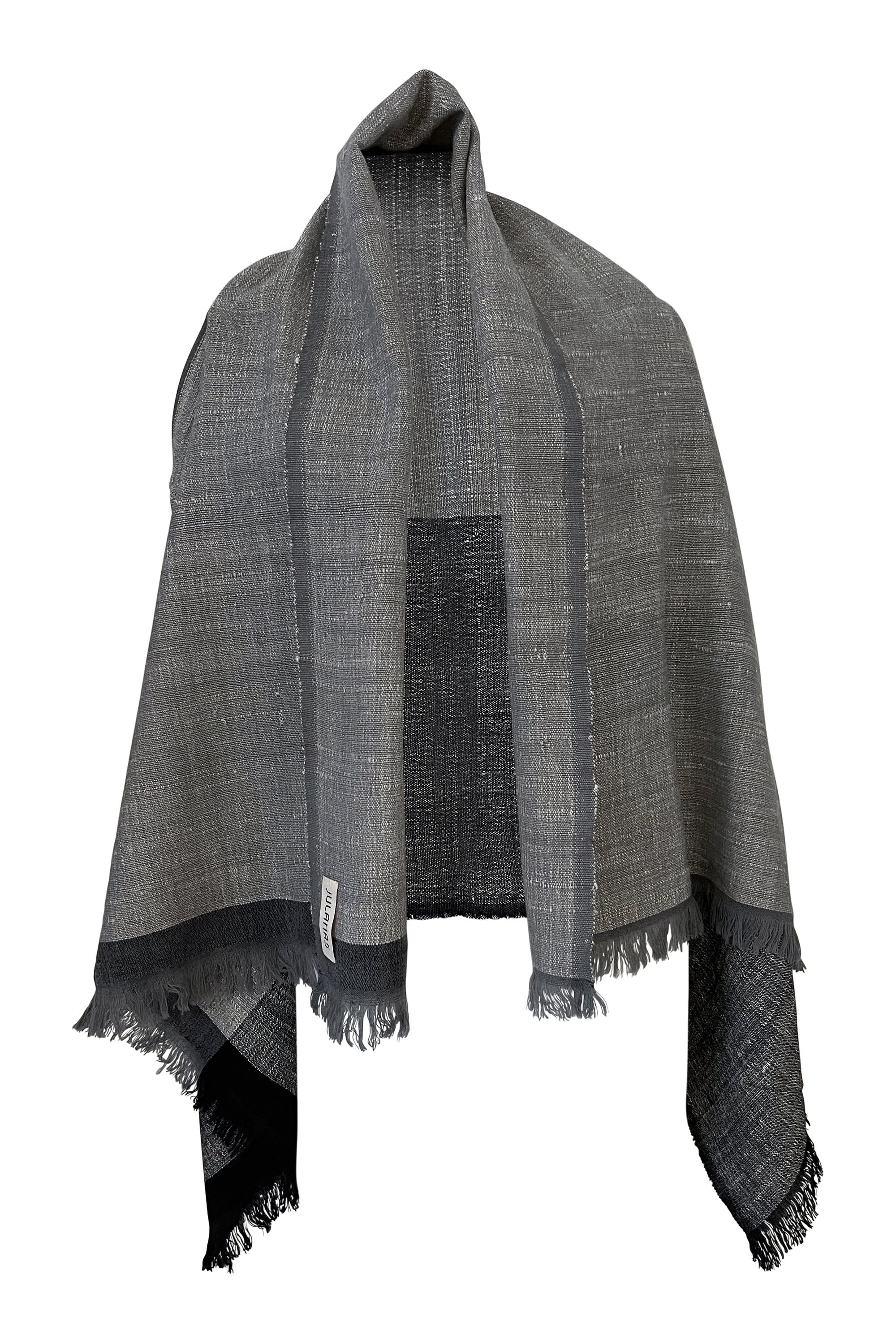 Handwoven from pure wool and handspun Ahimsa forest silk, it comes in Natural Undyed Silk, Black & Grey. Wear it open, wrapped, as a cowl, or even as a scarf, two accessories in one, perfect for both formal and casual settings.