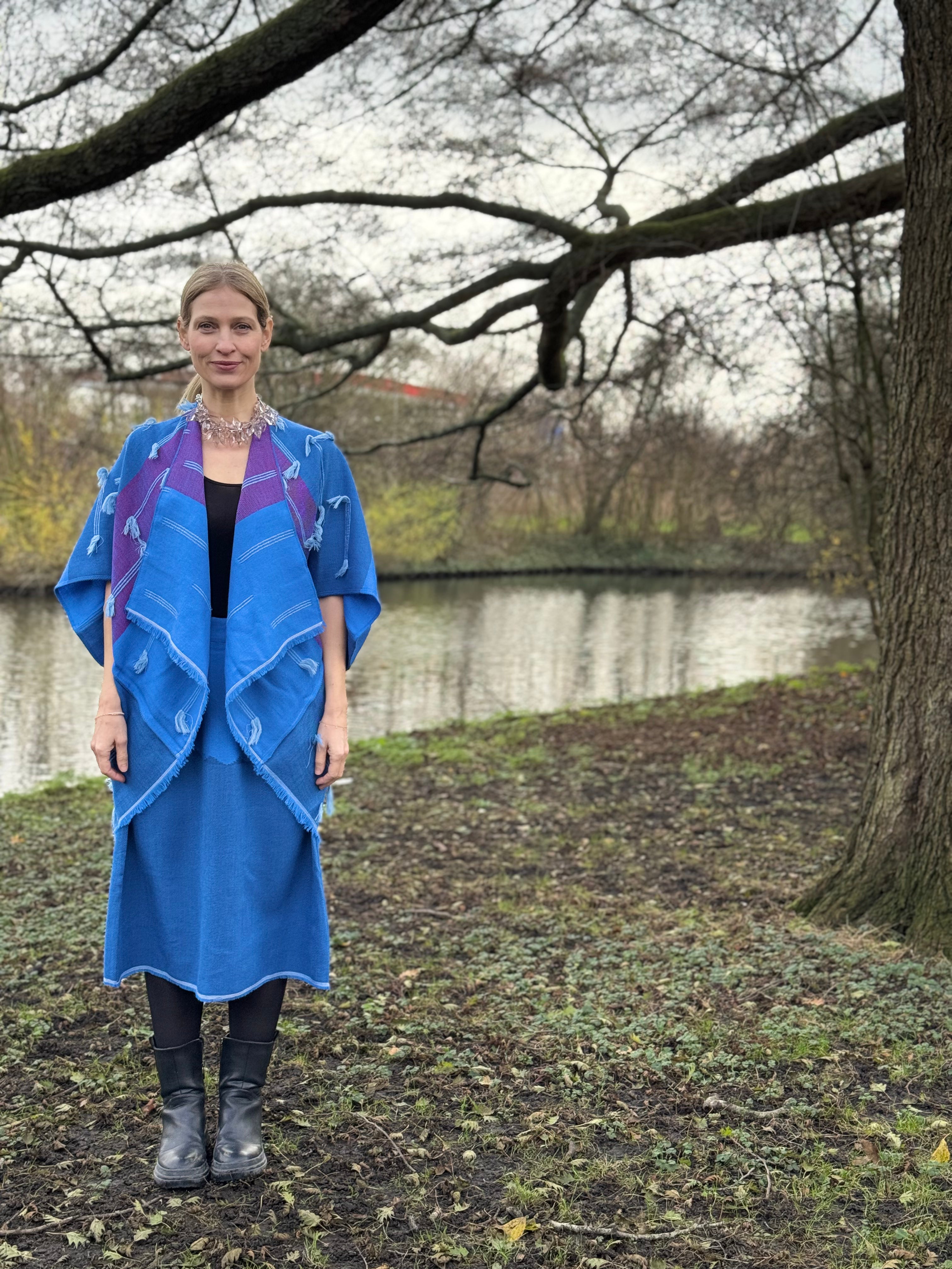 Inspired by the traditional Indian lungi, this handwoven wrap skirt features a fluid, straight silhouette designed to drape naturally around the body. Adjustable ties allow the fit to be customised at the waist and hips, offering ease, comfort, and freedom of movement. Crafted in wool, the piece balances practicality with everyday elegance—effortlessly transitioning from a layering essential to a statement silhouette.