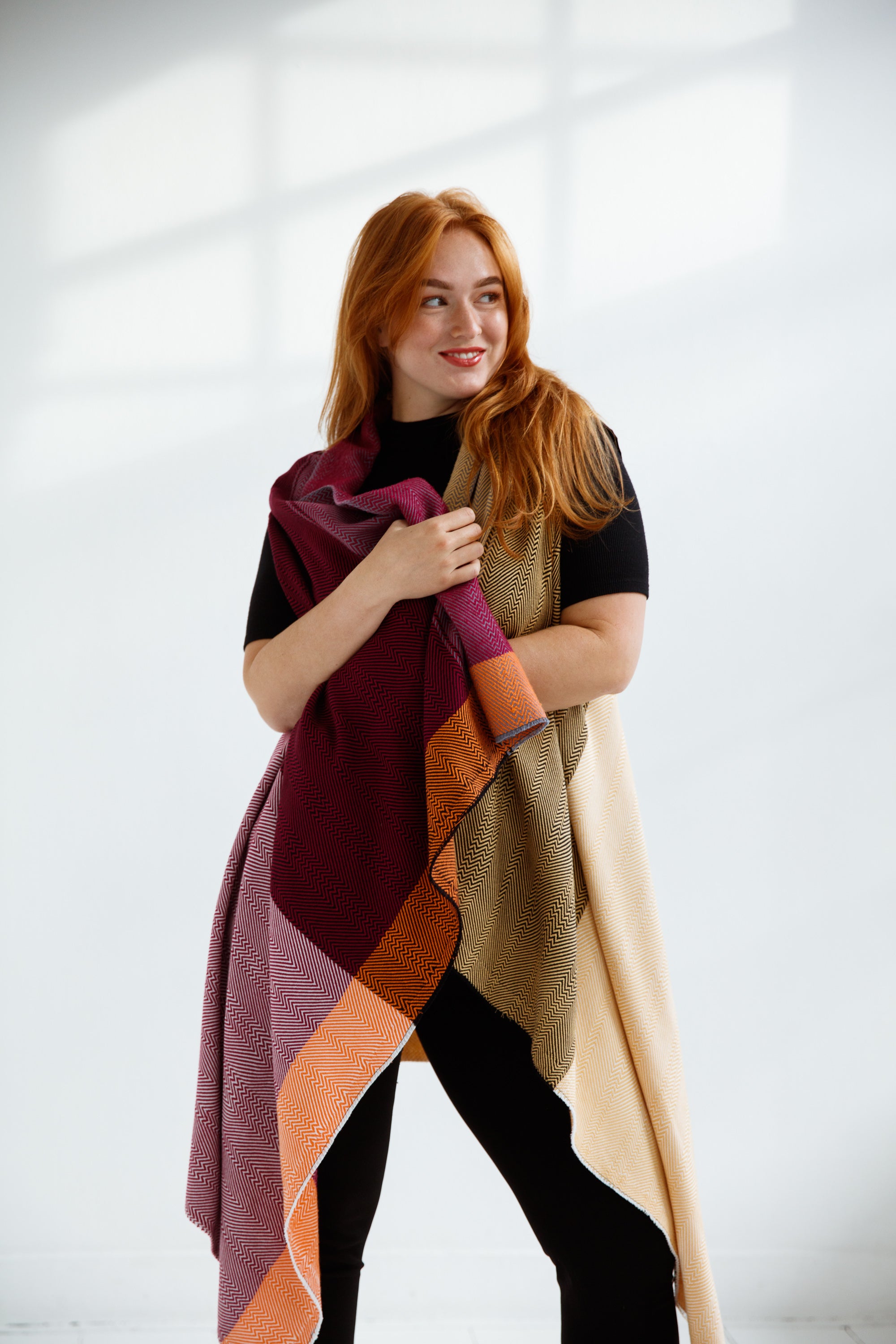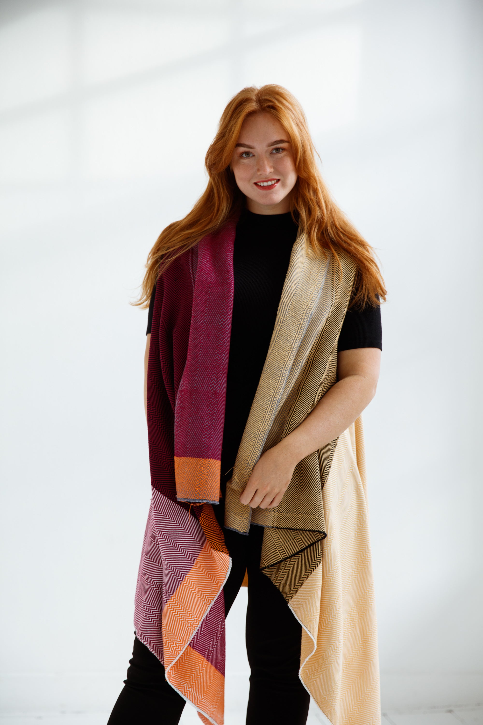 Versatile and free-size, it can be styled in 15+ ways, wrapped, belted, as a dress, or even a hoodie, adding effortless cheer to both casual and refined looks. A blend of orange, yellow, plum, and mustard tones creates a warm, luminous palette that lifts your mood and style alike.