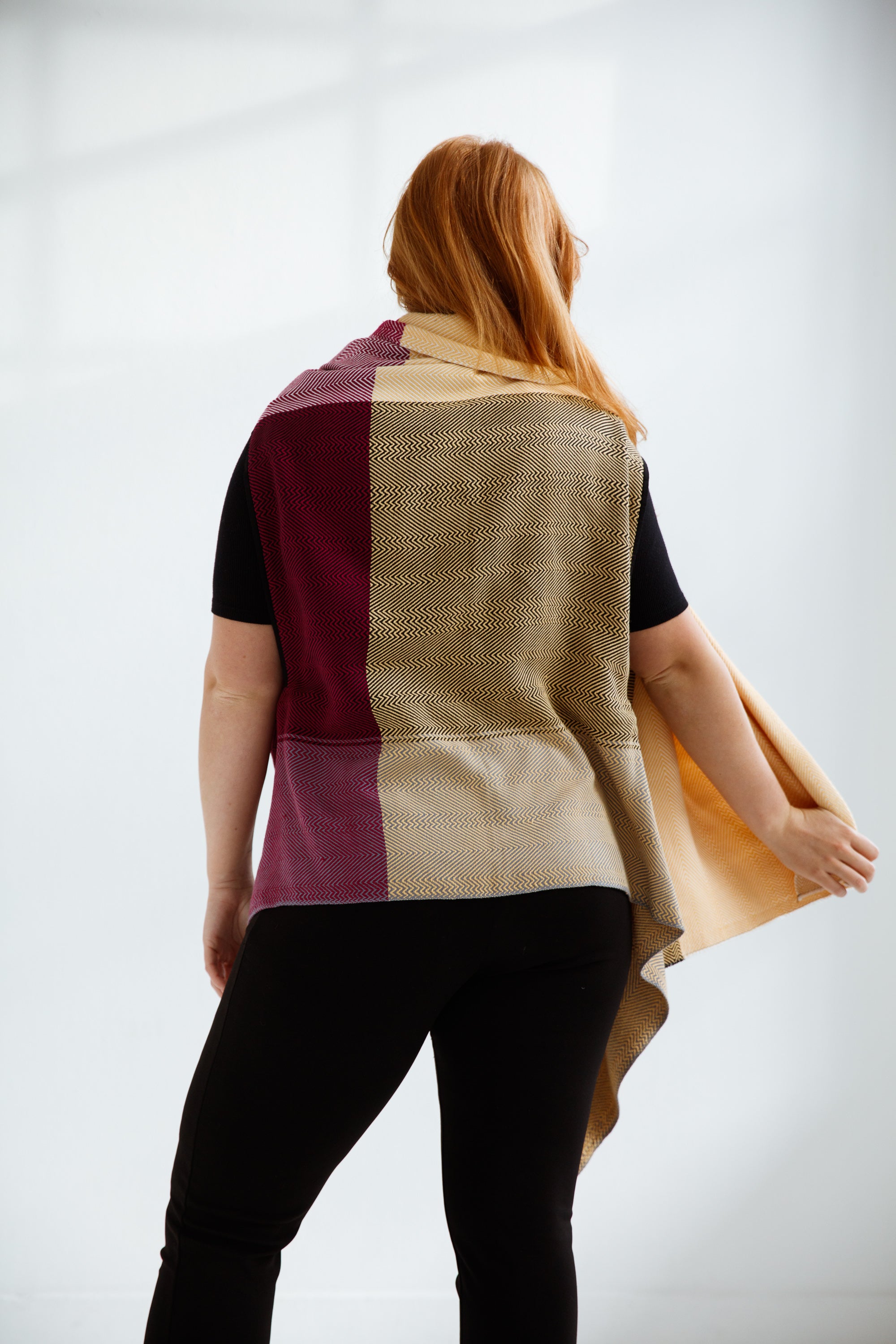 Handwoven in small batches from pure cotton by artisans at FiveP in Chennimalai, it is dyed with toxic-free colours at a GOTS-certified unit and crafted through a zero-waste process. Radiant, practical, and one-of-a-kind, the Peach Melba Cape blends modern European design with artisanal handloom craft for joyful, everyday elegance.