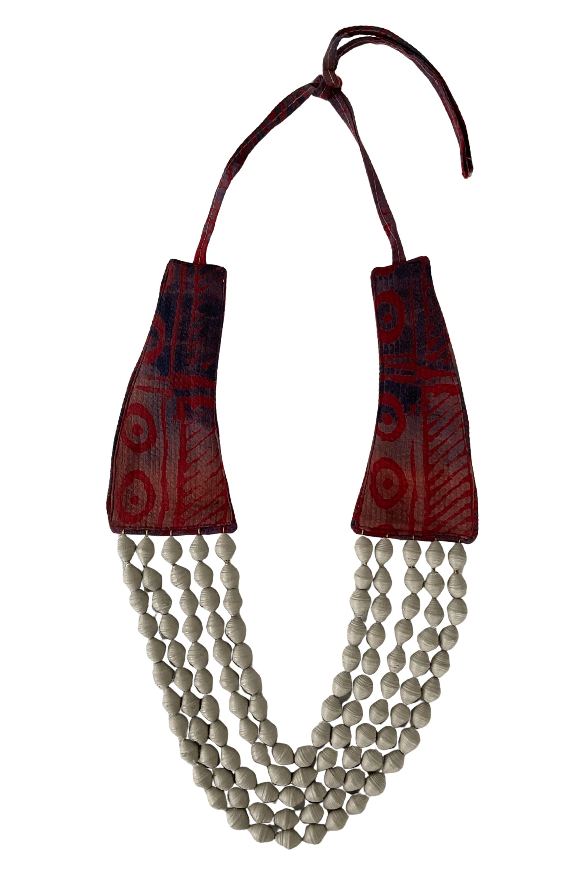 Designed for adaptable styling, the layered silhouette sits comfortably on a soft collar made from off-cut batik fabric scraps, reinforced with a cellulose-fiber Kraft paper lining for structure. An adjustable fabric tie at the back lets you wear it at varying lengths. The rich texture and multi-strand form elevate everyday looks and occasion wear alike, pairing easily with minimalist dresses, jumpsuits, or cultural attire for a balanced, modern expression of heritage craft.