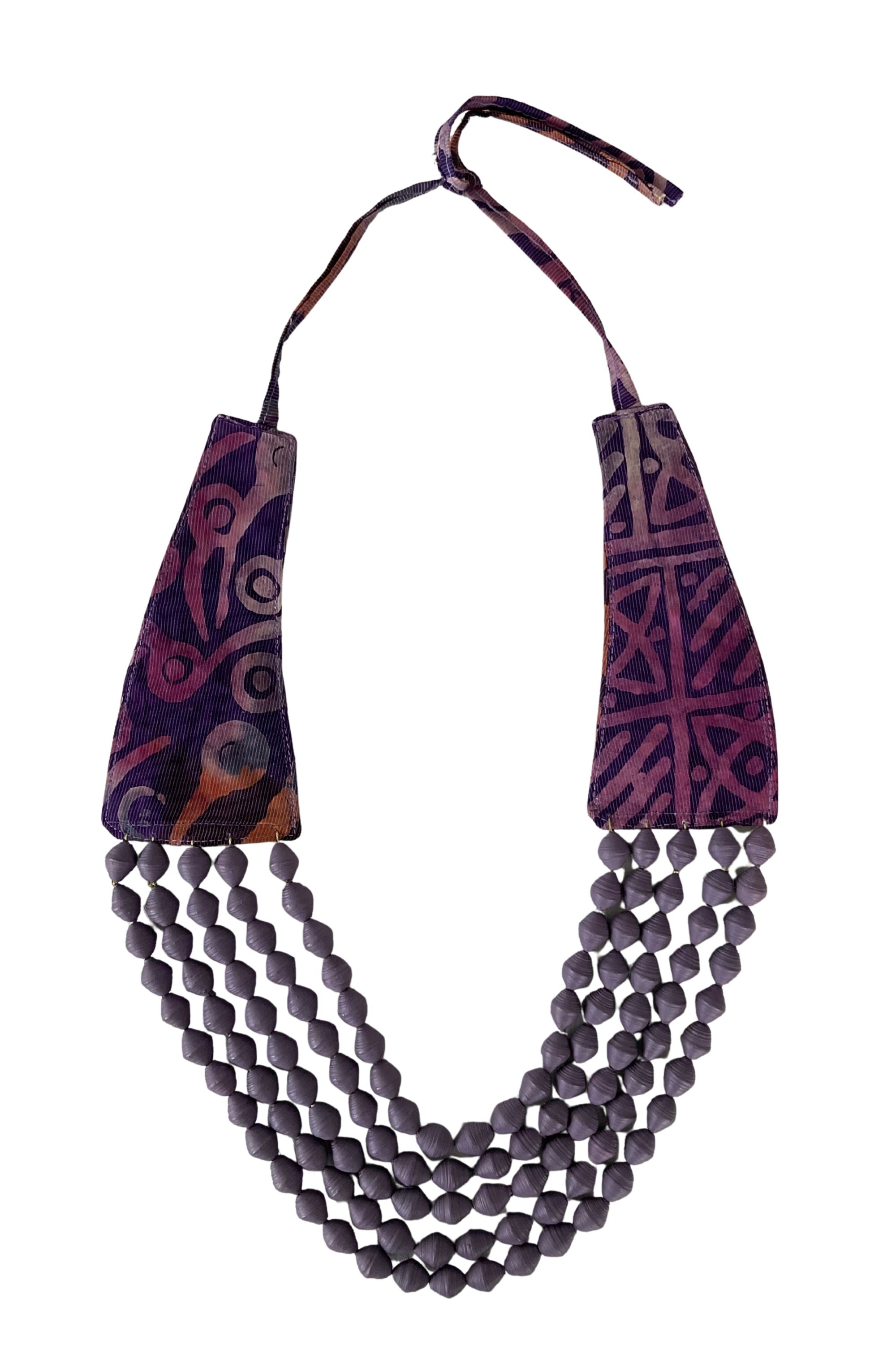 Five elegant strands of hand-rolled paper beads come together in this statement necklace—each bead shaped, painted, and assembled by refugee and internally displaced women trained through our crafting partner Udiri’s artisan program in Lagos, Nigeria. The adjustable fabric tie at the back makes it easy to wear at varying lengths.