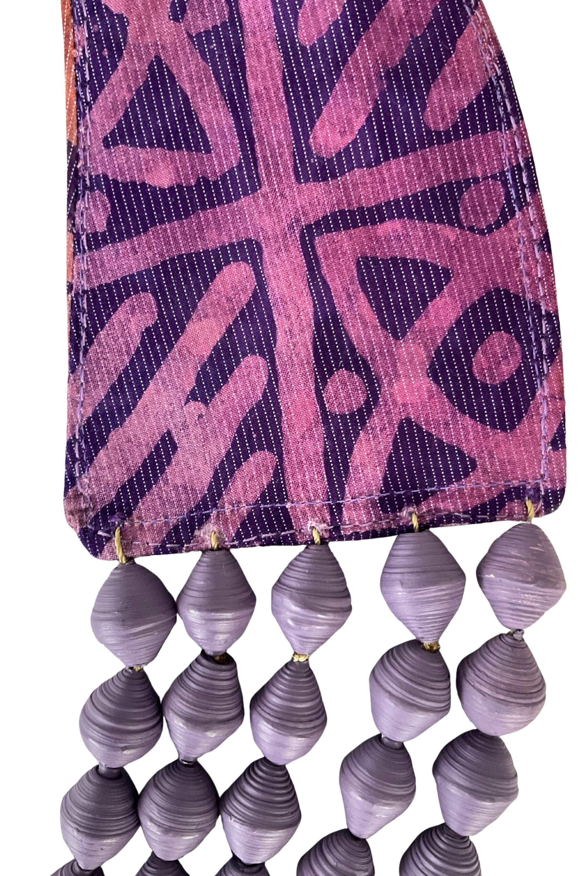 The strands are anchored by a soft collar crafted from off-cut batik fabric scraps—adding pattern, color, and comfort. For structure, the collar is reinforced with a lining made from scraped cellulose fiber Kraft paper, and finished with an adjustable fabric tie at the back.