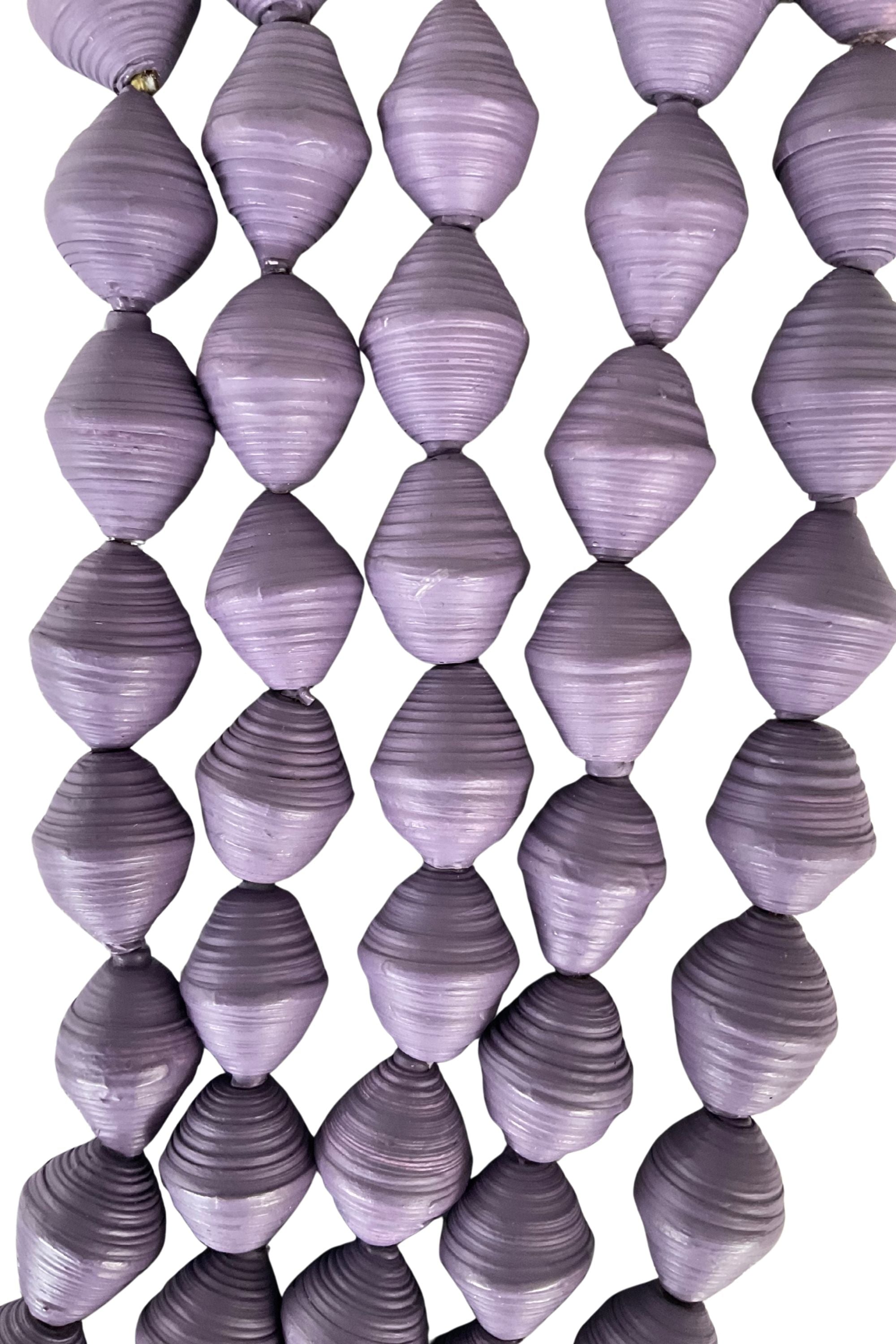 The beads begin as recycled paper—cut, coiled with precision, and carefully sealed to create smooth, lightweight forms. Every piece is painted by hand, revealing natural variations and texture that make each necklace truly one of a kind.