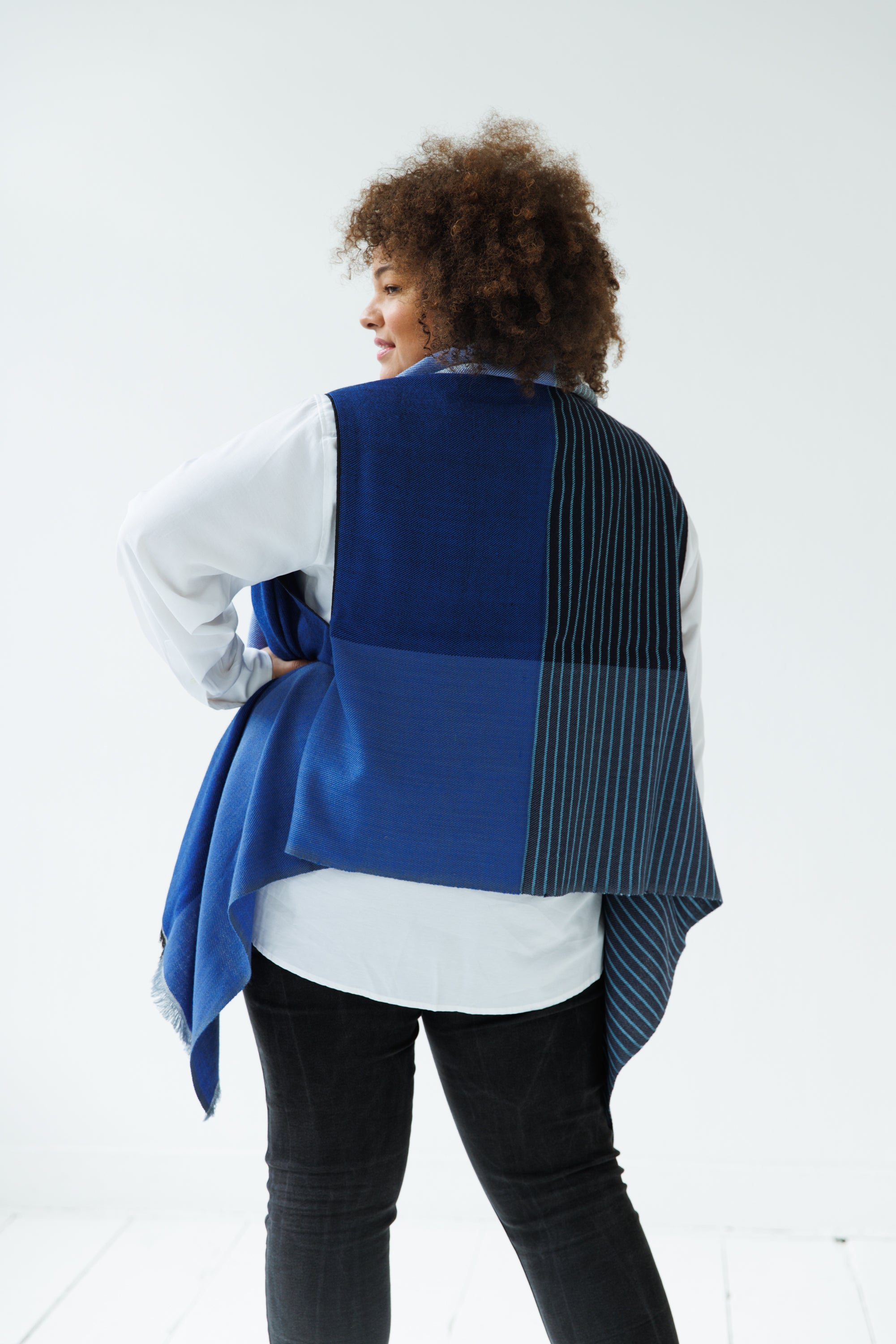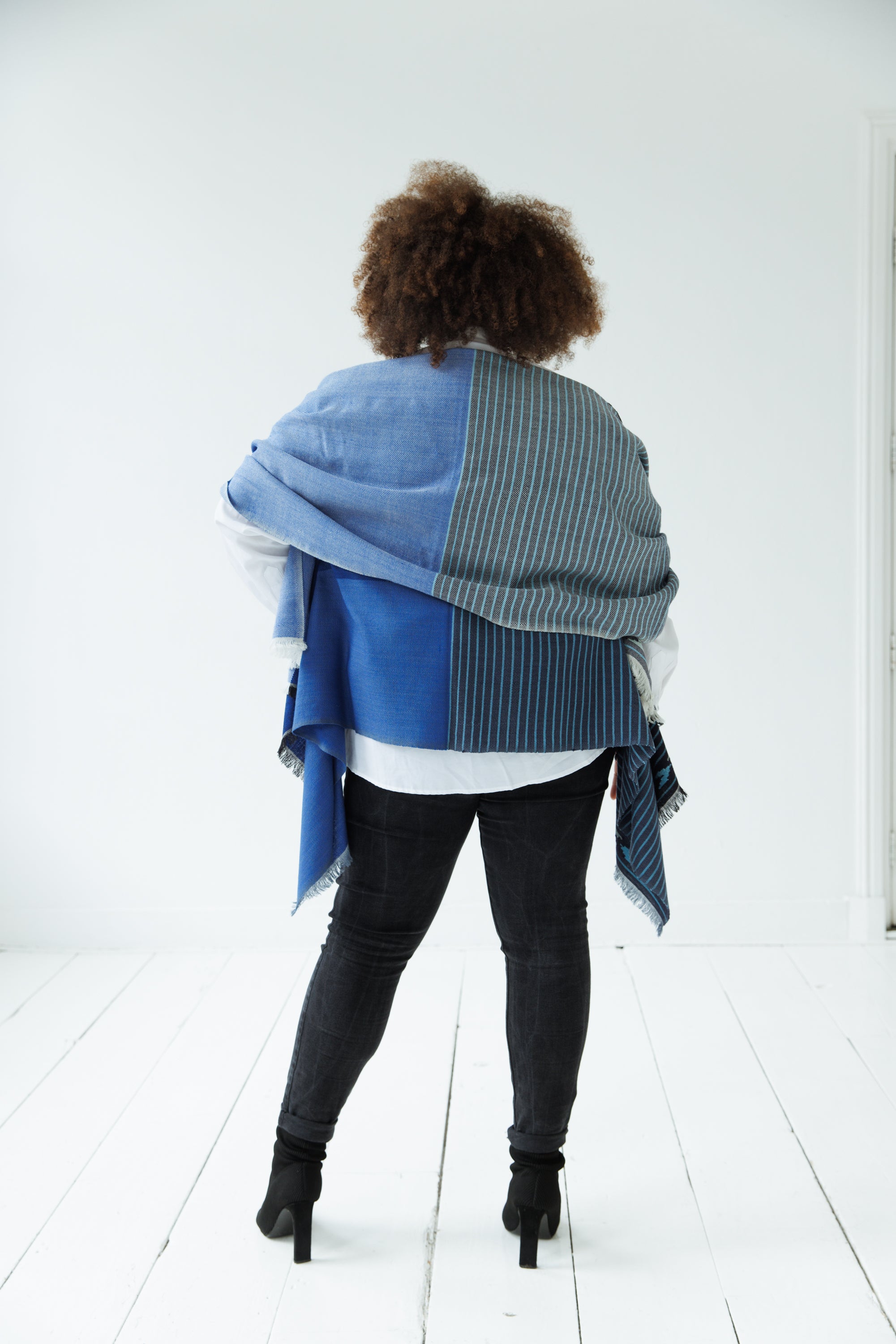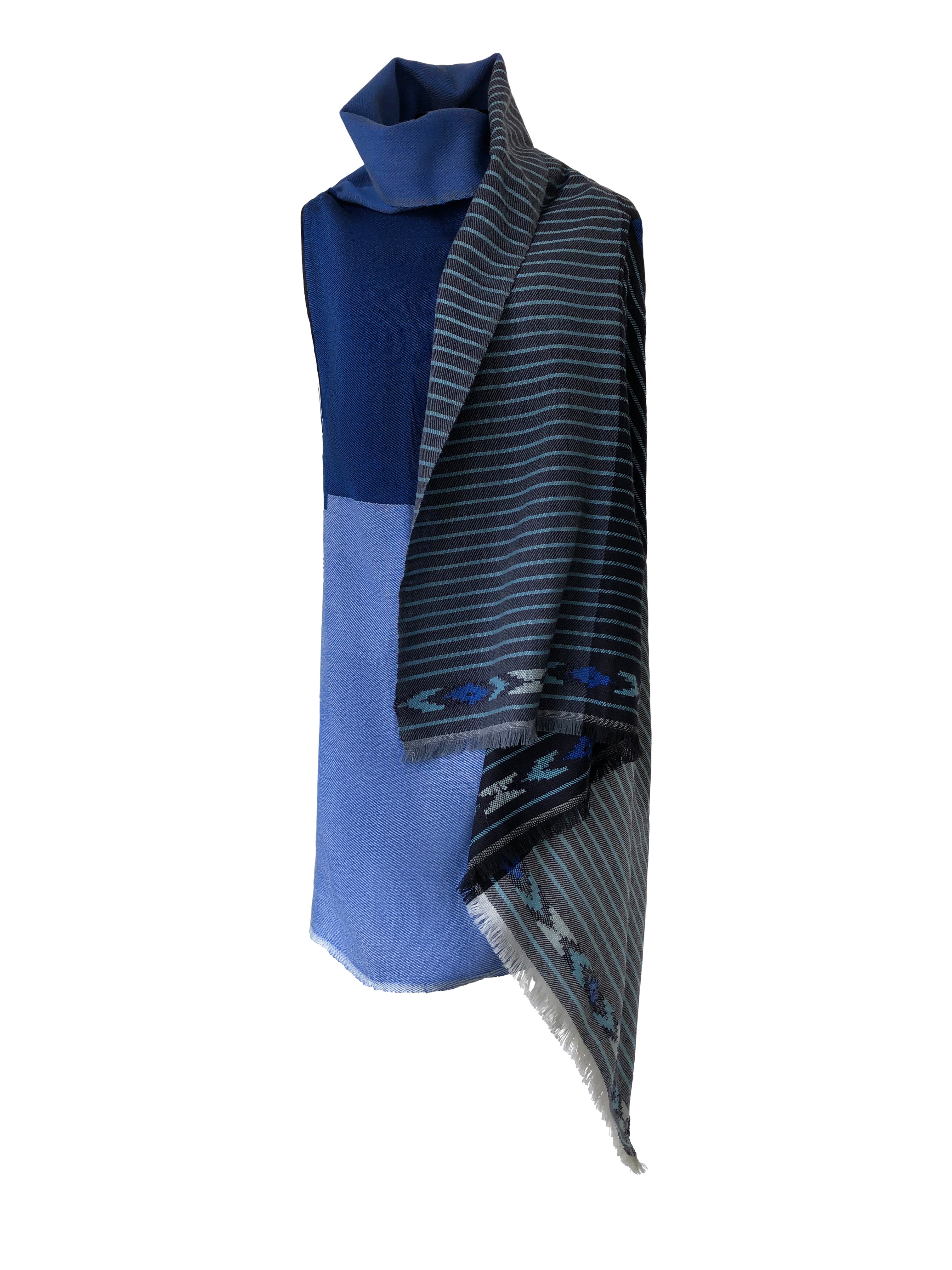 Colour-blocks meet fine wool in the Cape Fusion Blue, a 15-in-one versatile piece that blends geometric patterns with traditional craft. Handwoven from 100% wool, it offers warmth year-round yet stays light enough to carry in your bag.
