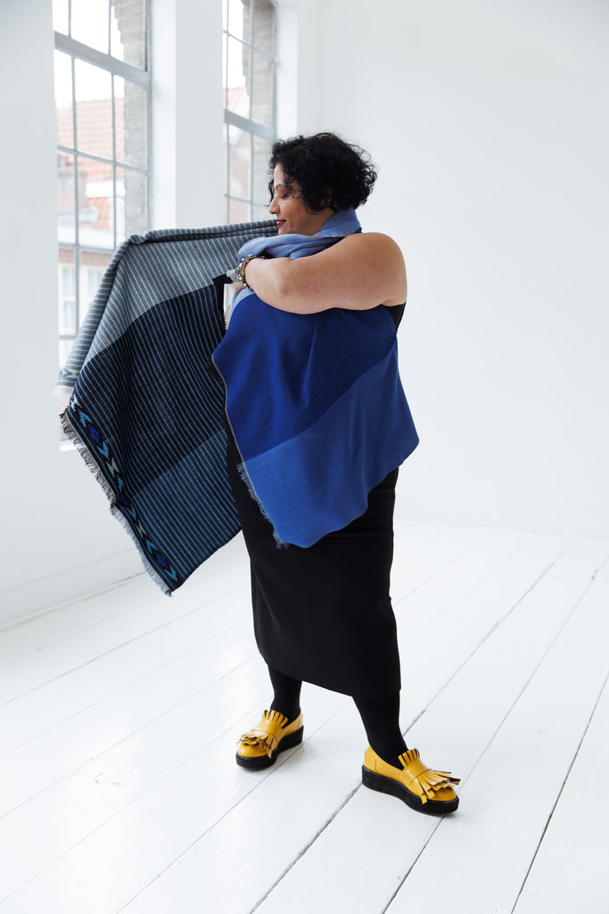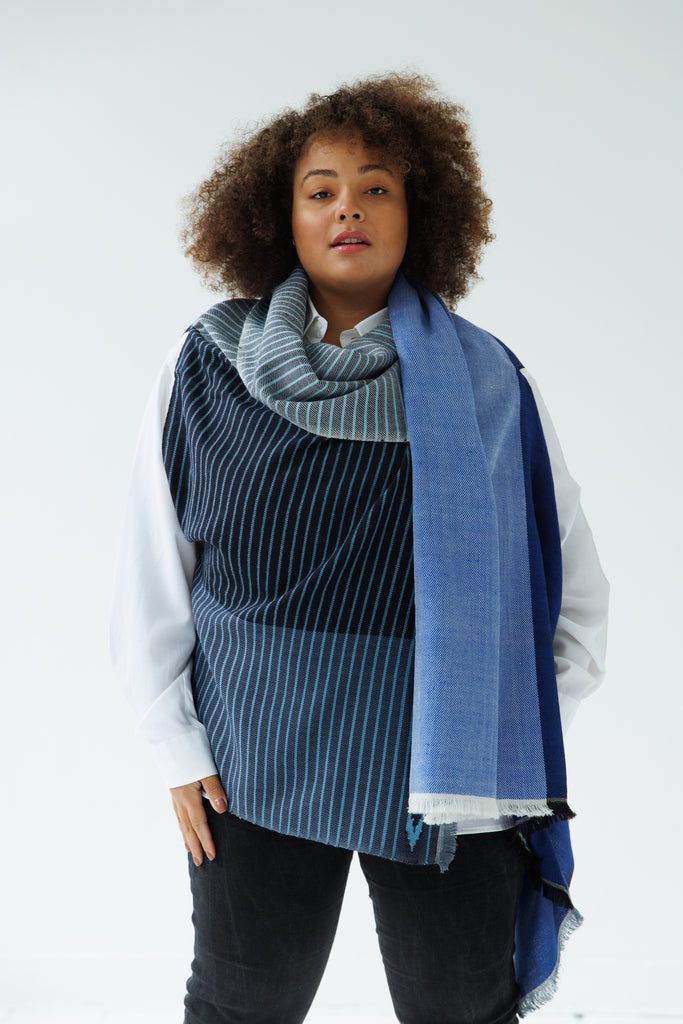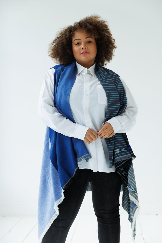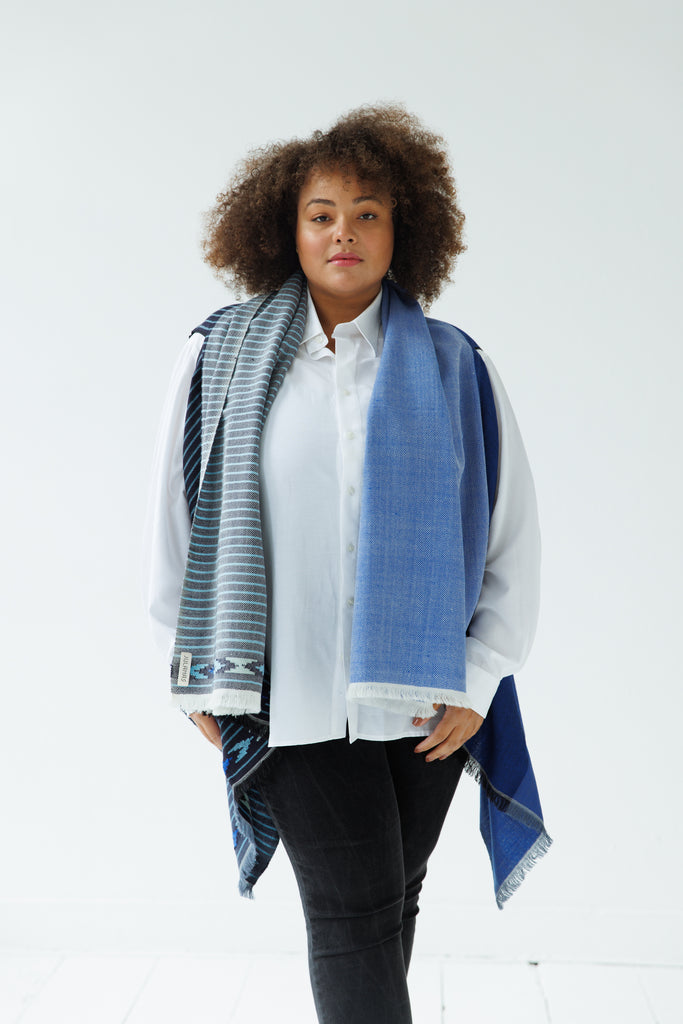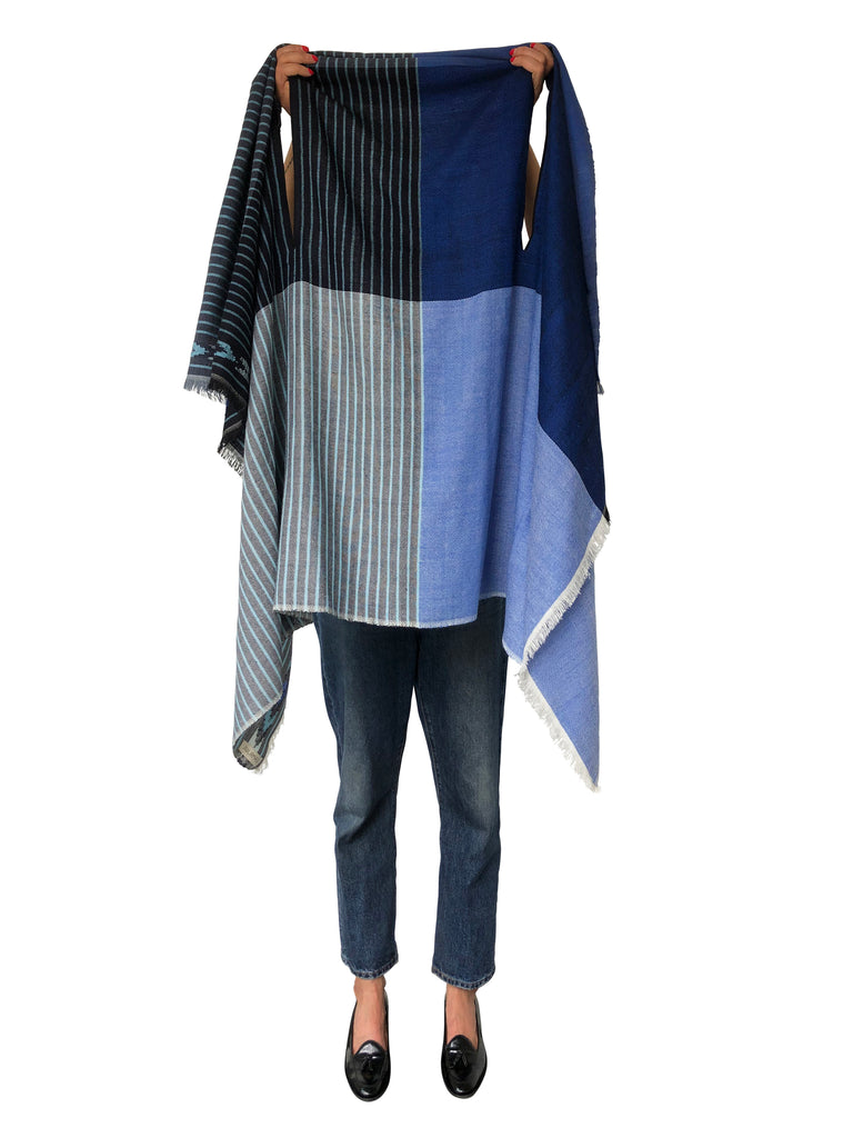 Colour-blocks meet fine wool in the Cape Fusion Blue, a 15-in-one versatile piece that blends geometric patterns with traditional craft. Handwoven from 100% wool, it offers warmth year-round yet stays light enough to carry in your bag.