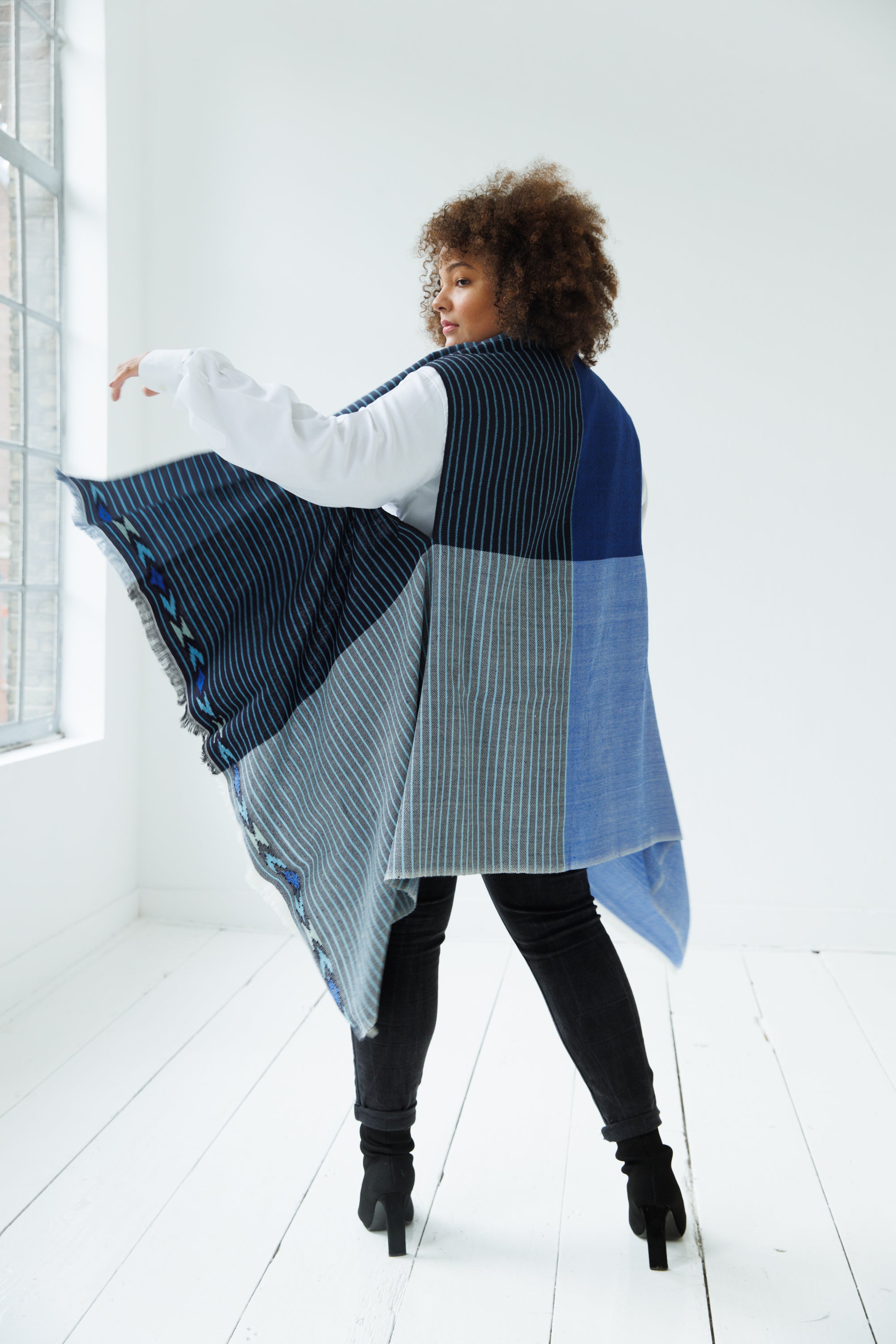 Designed in Amsterdam and handcrafted in the Himalayas, its clever armhole placement allows endless styling — long as a poncho, short like a scarf, or belted as a dress.