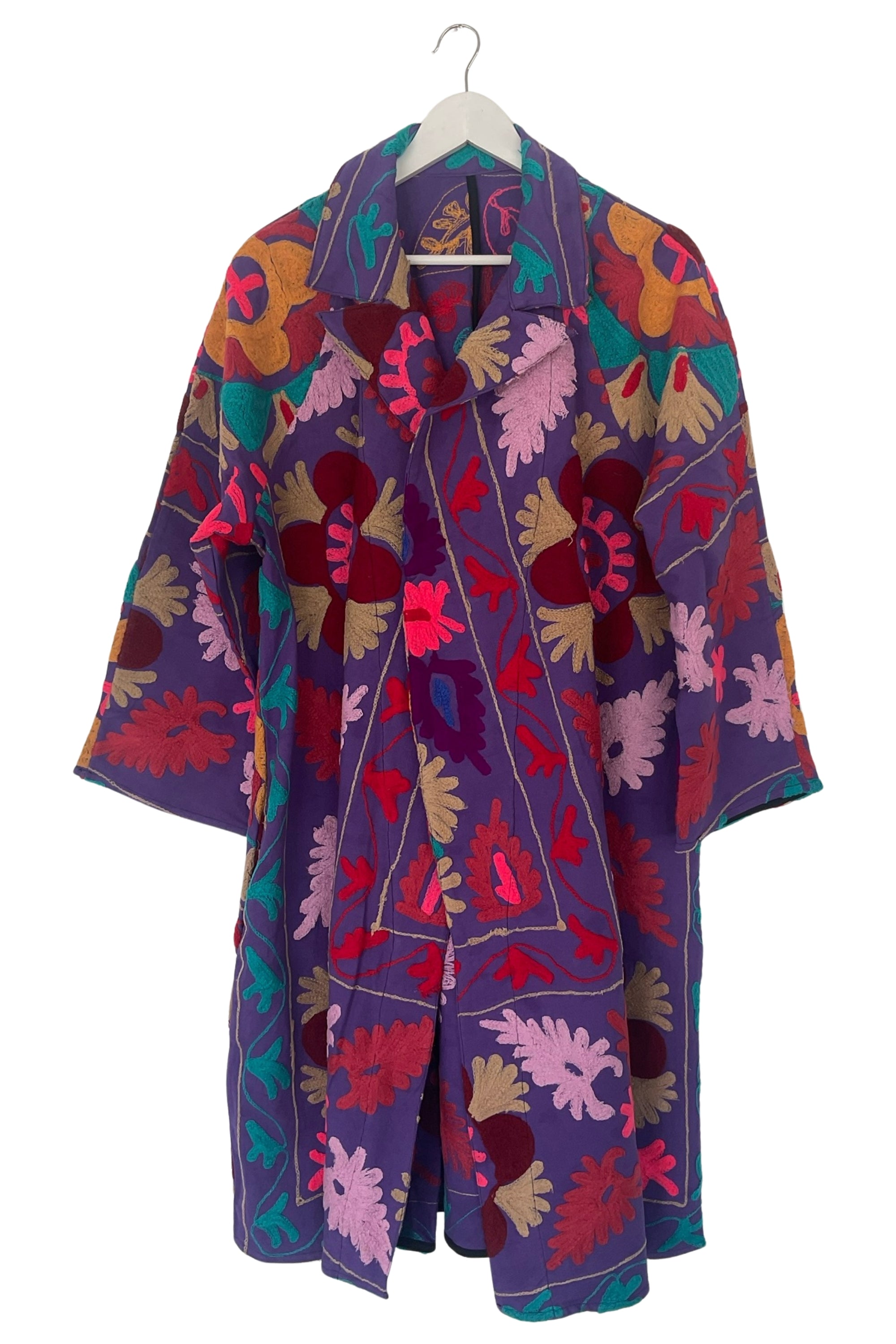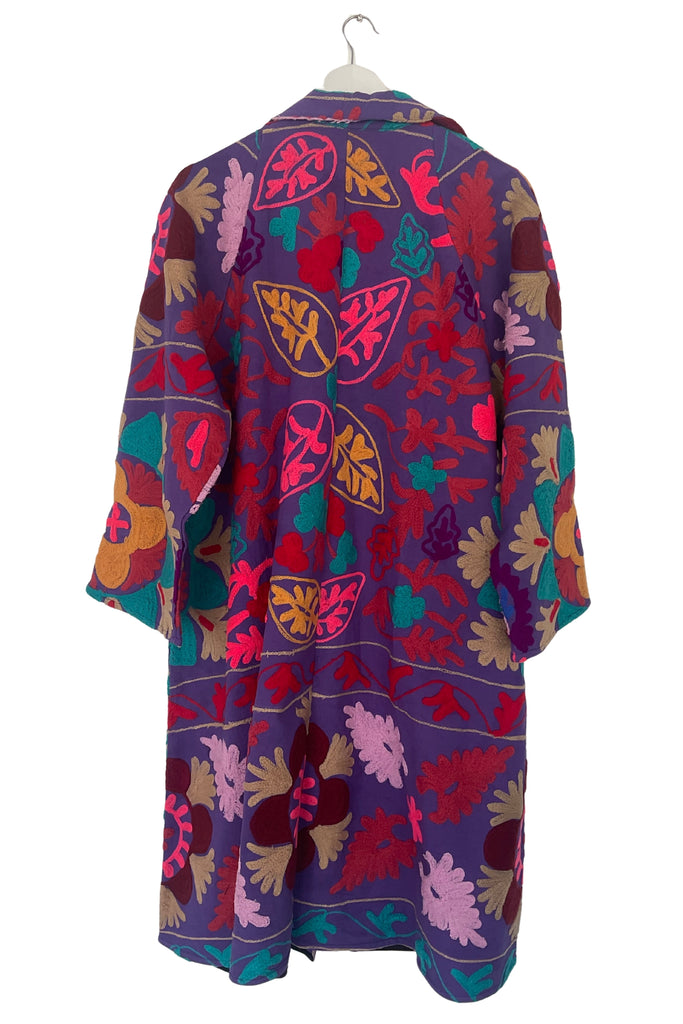 Our Suzani Duster features statement collars, an a-line cut, long sleeves, and comes with pockets. Each piece is handmade and tell the story of a centuries-old craft.