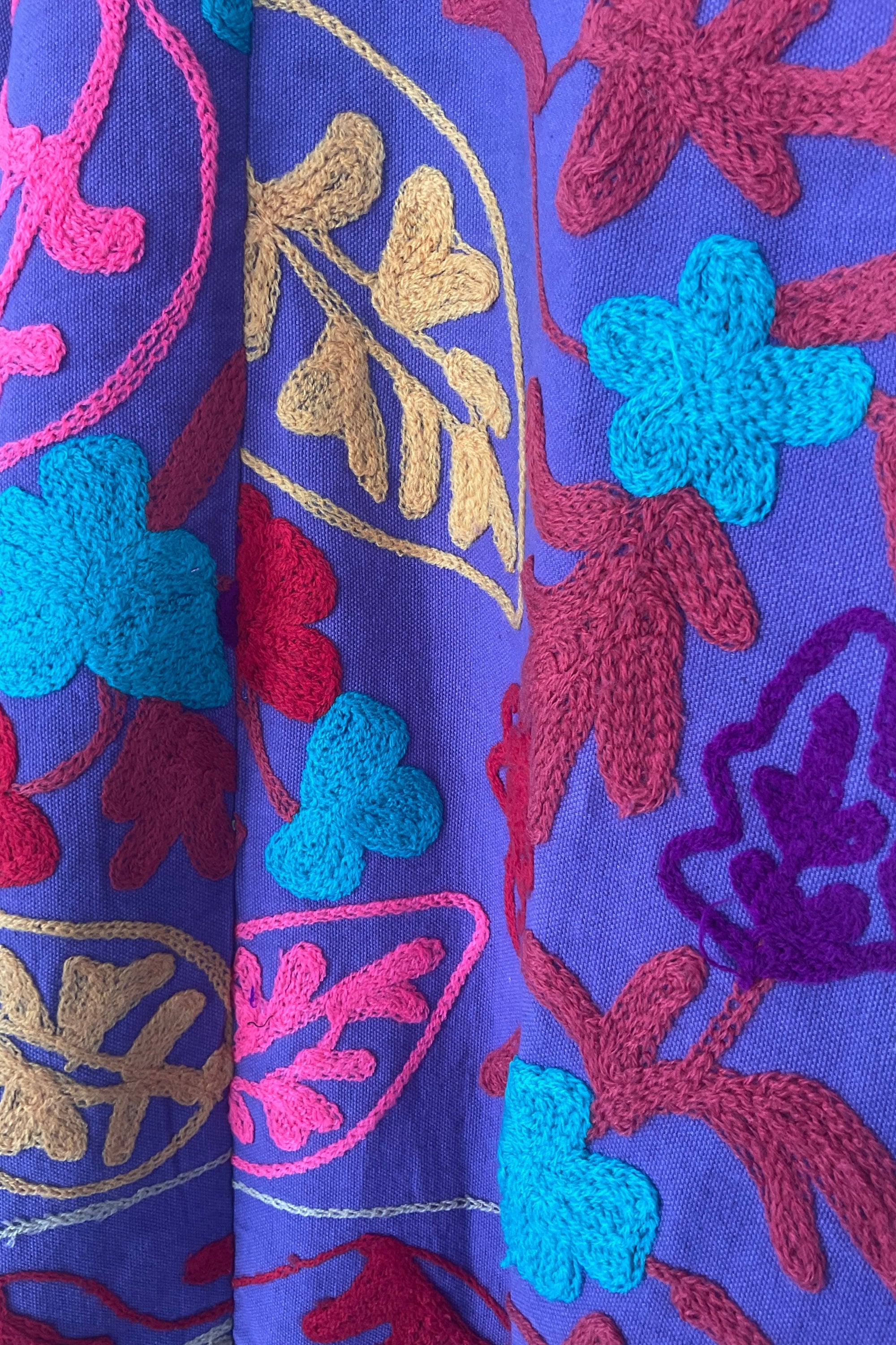 Make a colour and style statement with our long, embroidered Suzani Duster. This unique piece is handcrafted from an embroidered blanket, making it one of a kind. Wear it as a wrap dress, pair with your favourite leggings, over a pair of jeans or with a simple dress.