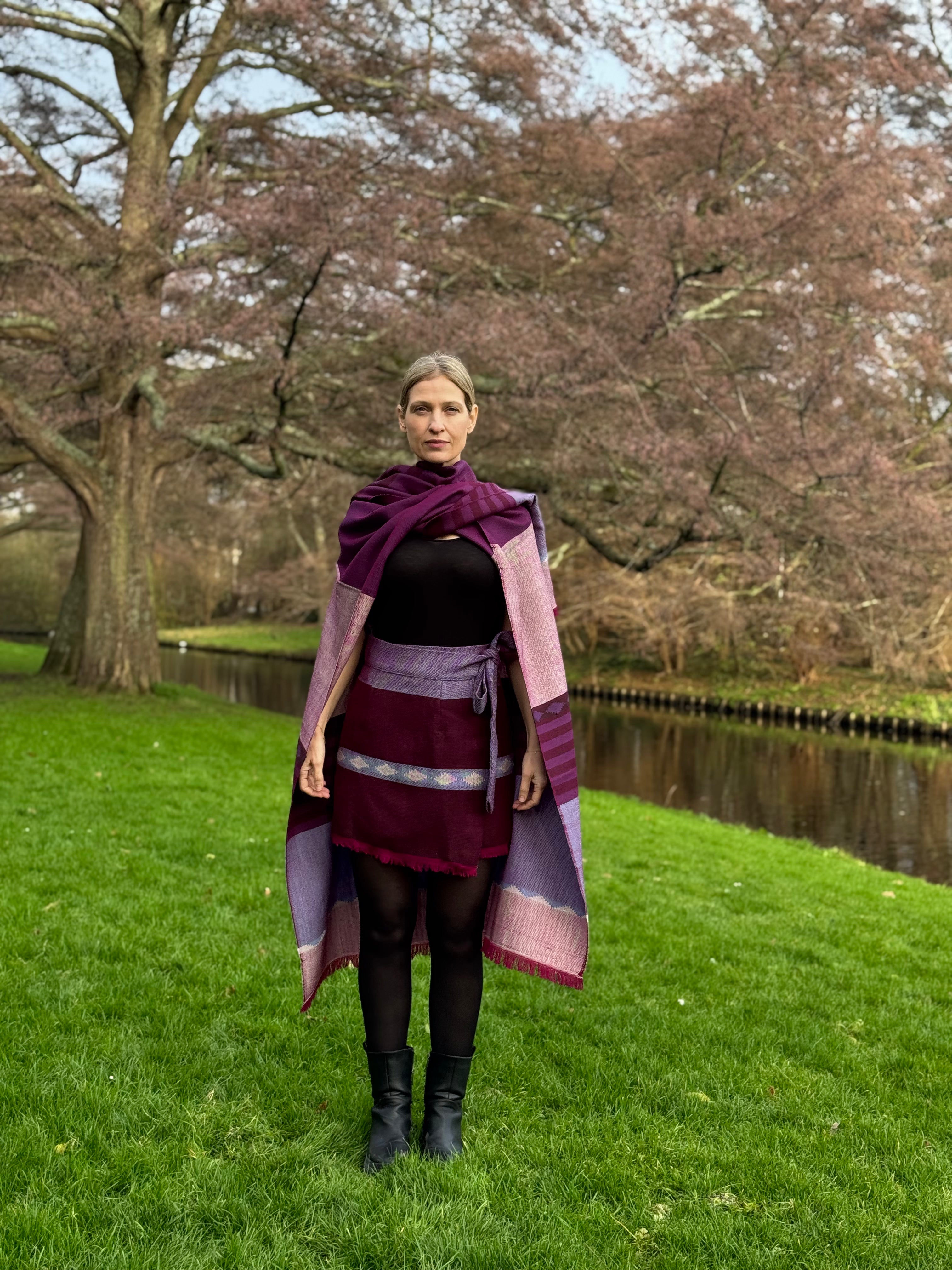 Handwoven on traditional looms, our mini wrap skirt features textured weaving inspired by the contours of mountains and drifting clouds. The adjustable wrap silhouette allows it to be worn high or low on the waist, adapting easily to different body shapes and styling preferences. Style it as a statement piece with minimal layers, or pair it with our wool ruana or sweater.