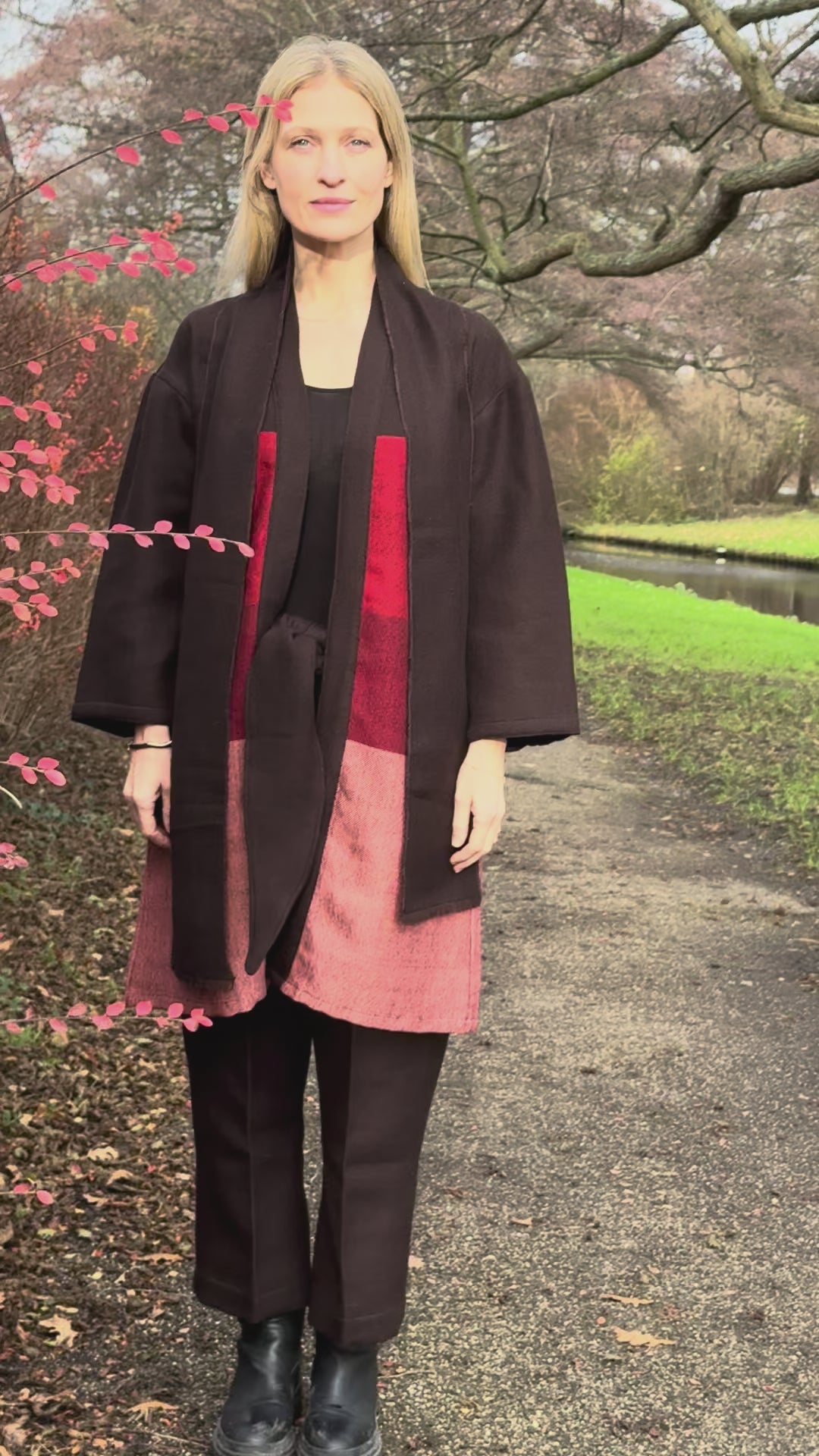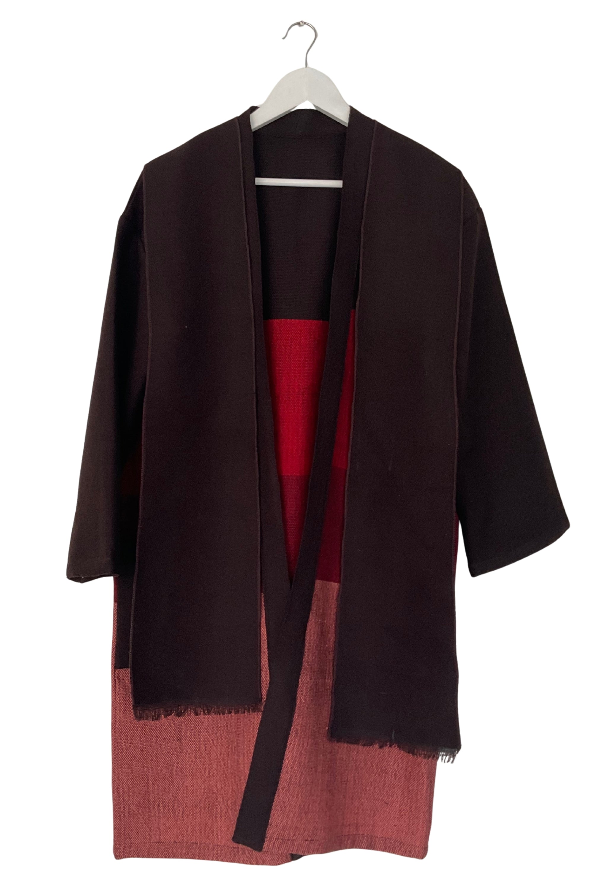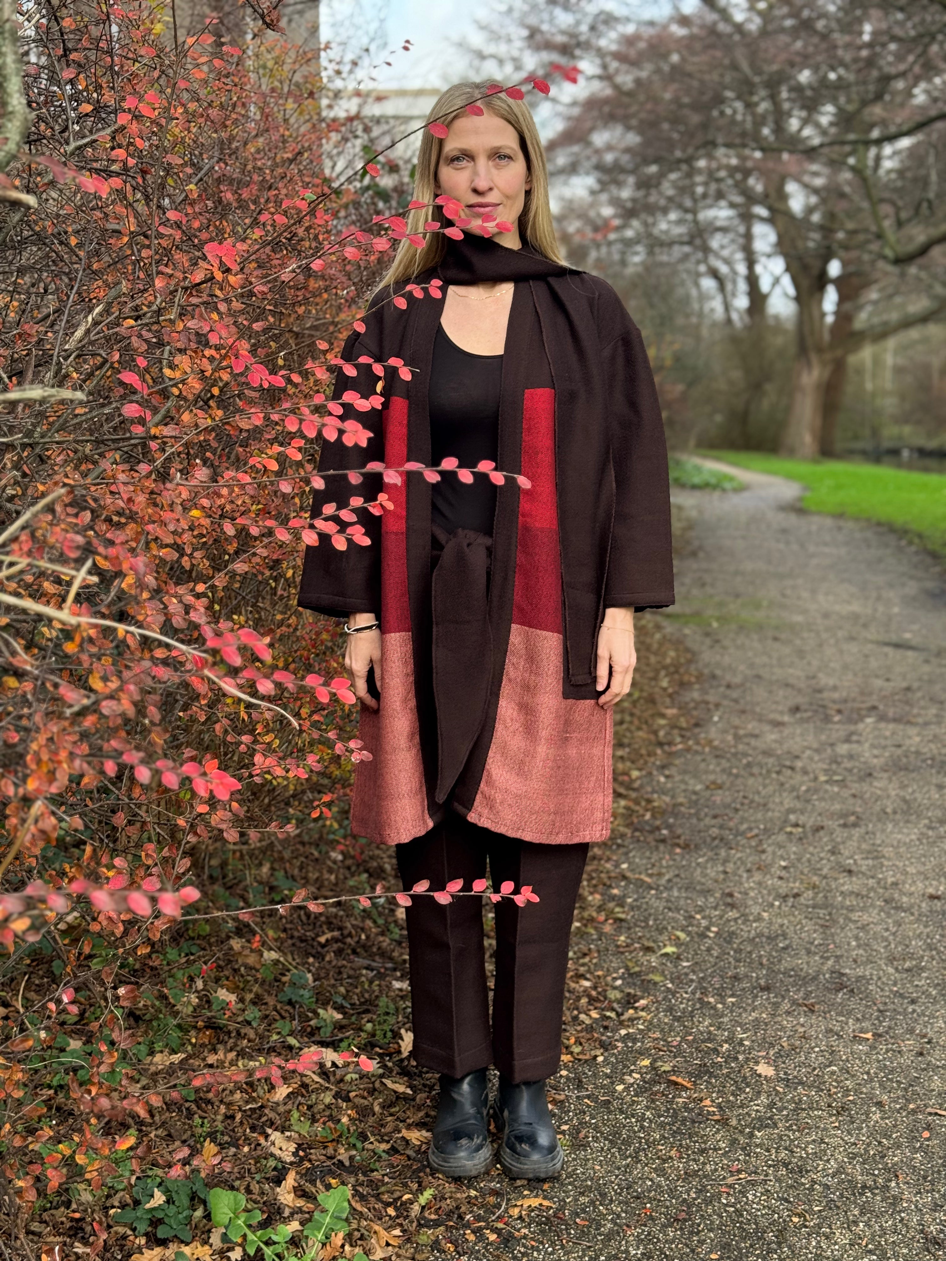 Our Highland Trail open-front jacket is accompanied by a matching muffler, offering warmth without weight. The fluid silhouette and handwoven texture create an effortless elegance, while the muffler adds a refined, versatile finishing layer. Pair it with our Highland Trail Wool Wrap pants.