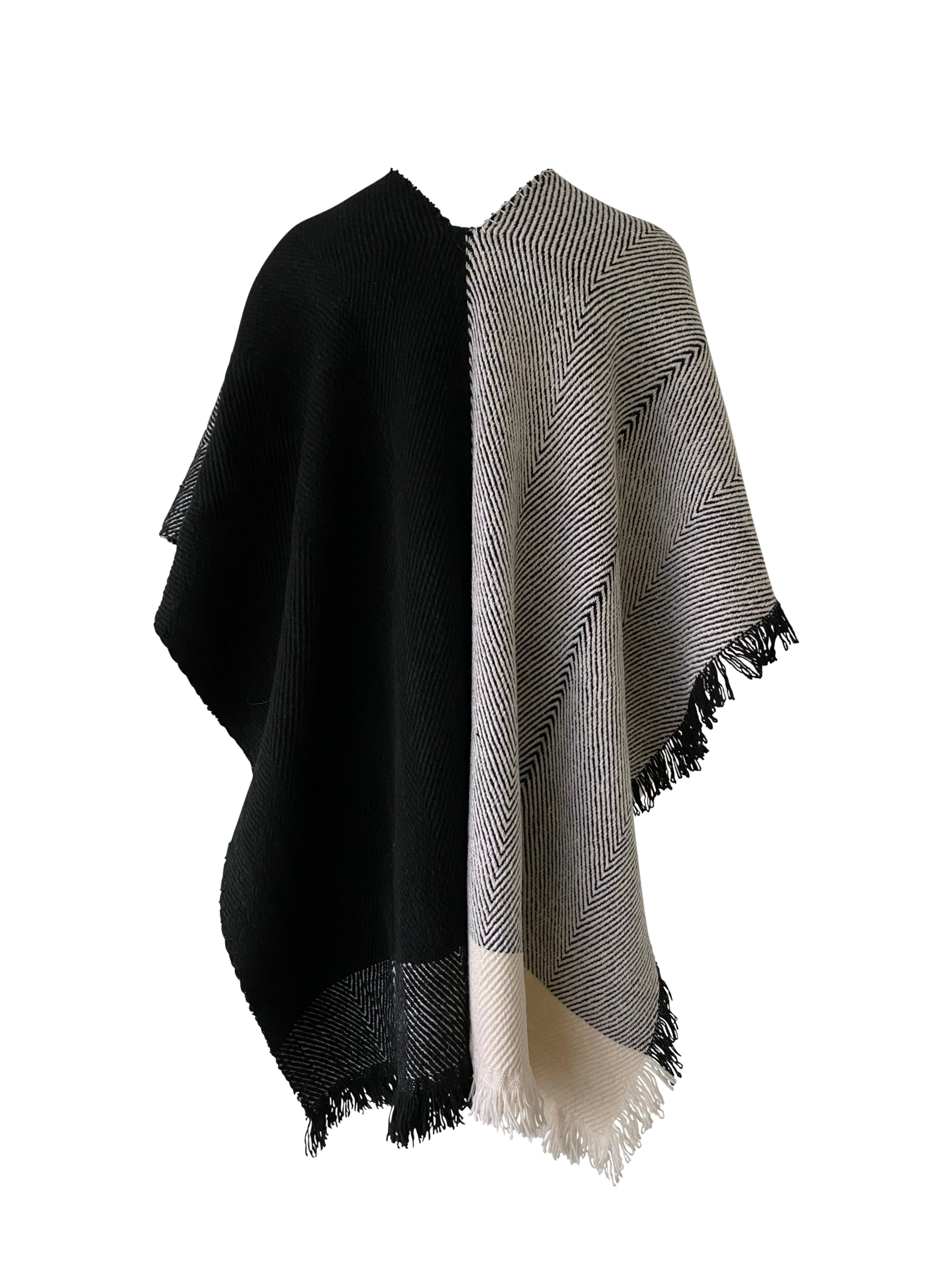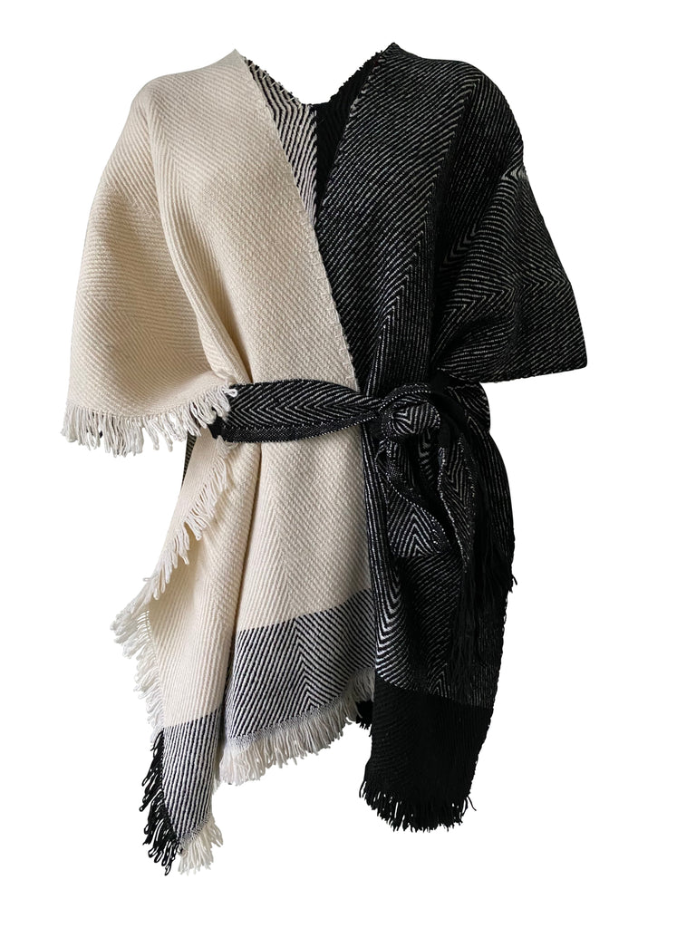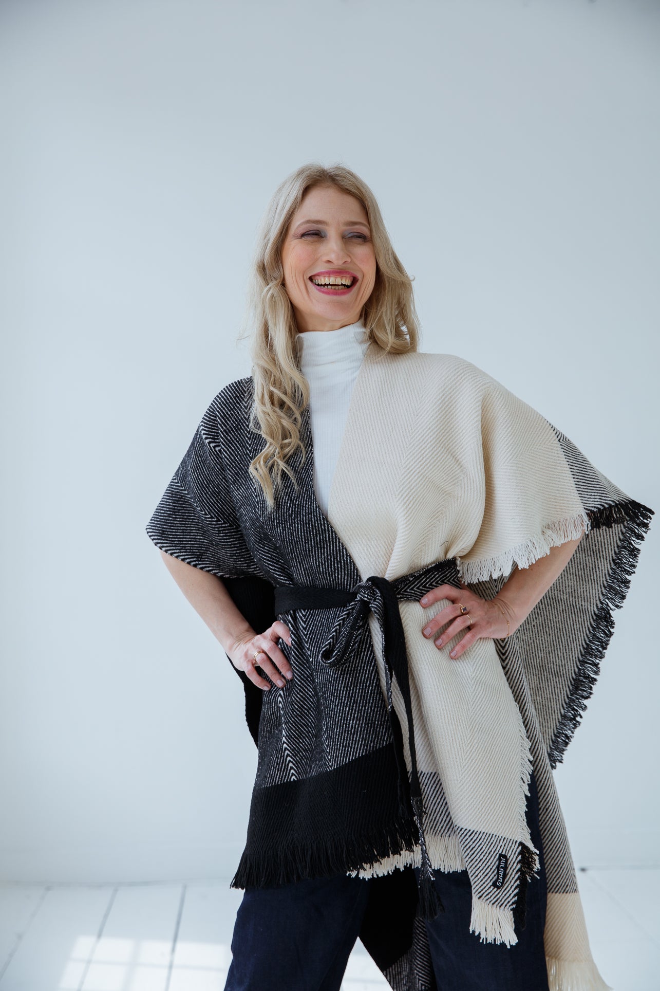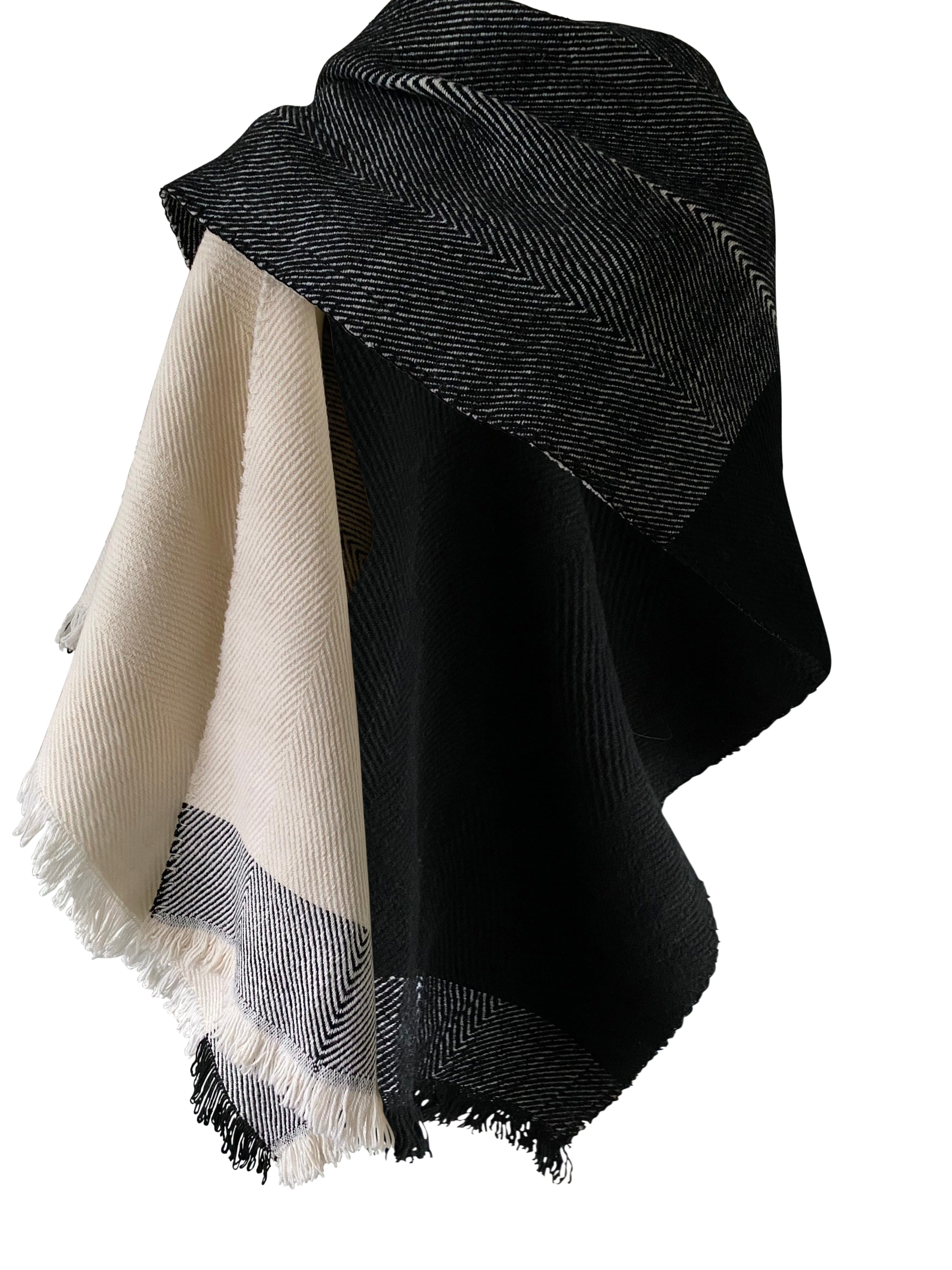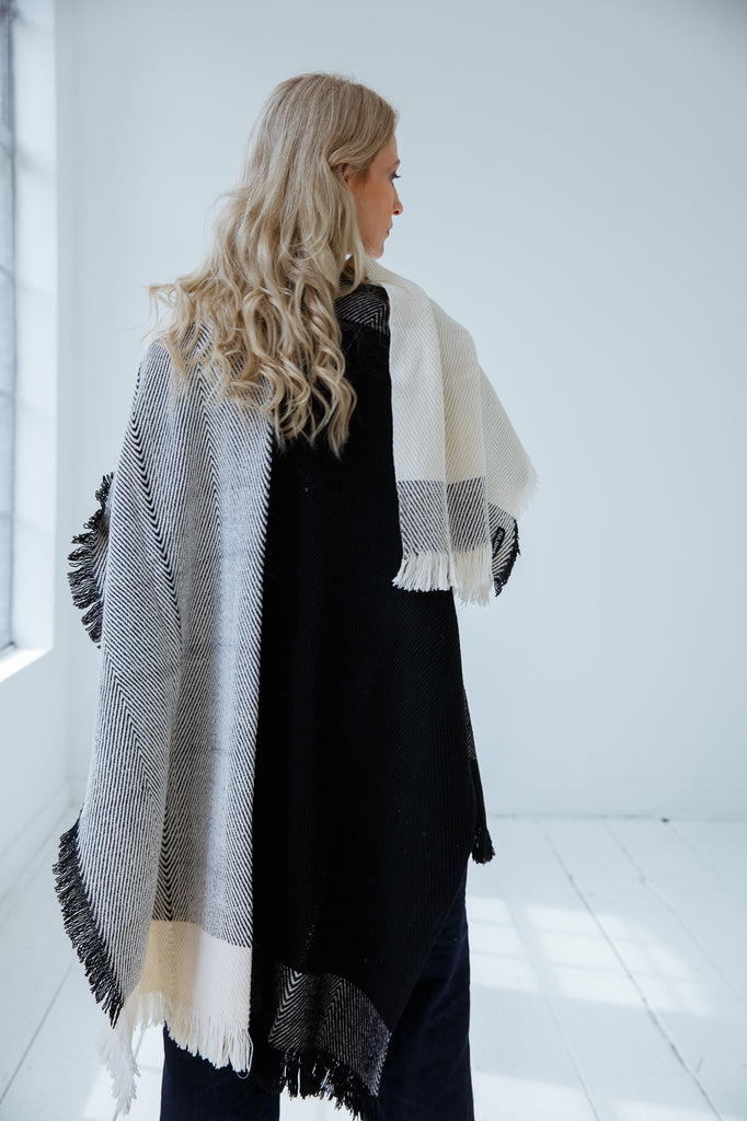 Add cozy elegance and a touch of luxury to your favourite dress or top with our chunky wool Ruana Beyond black and white that weighs approximately 1 kg. Open in the front for easy wearing and ideal for plus or petite sizes, this ultra stylish Ruana  looks like a wrap but feels like a blanket. Throw on this extra layer and style it in a number of different ways -- casual when you’re at home or stylish when you step outside.