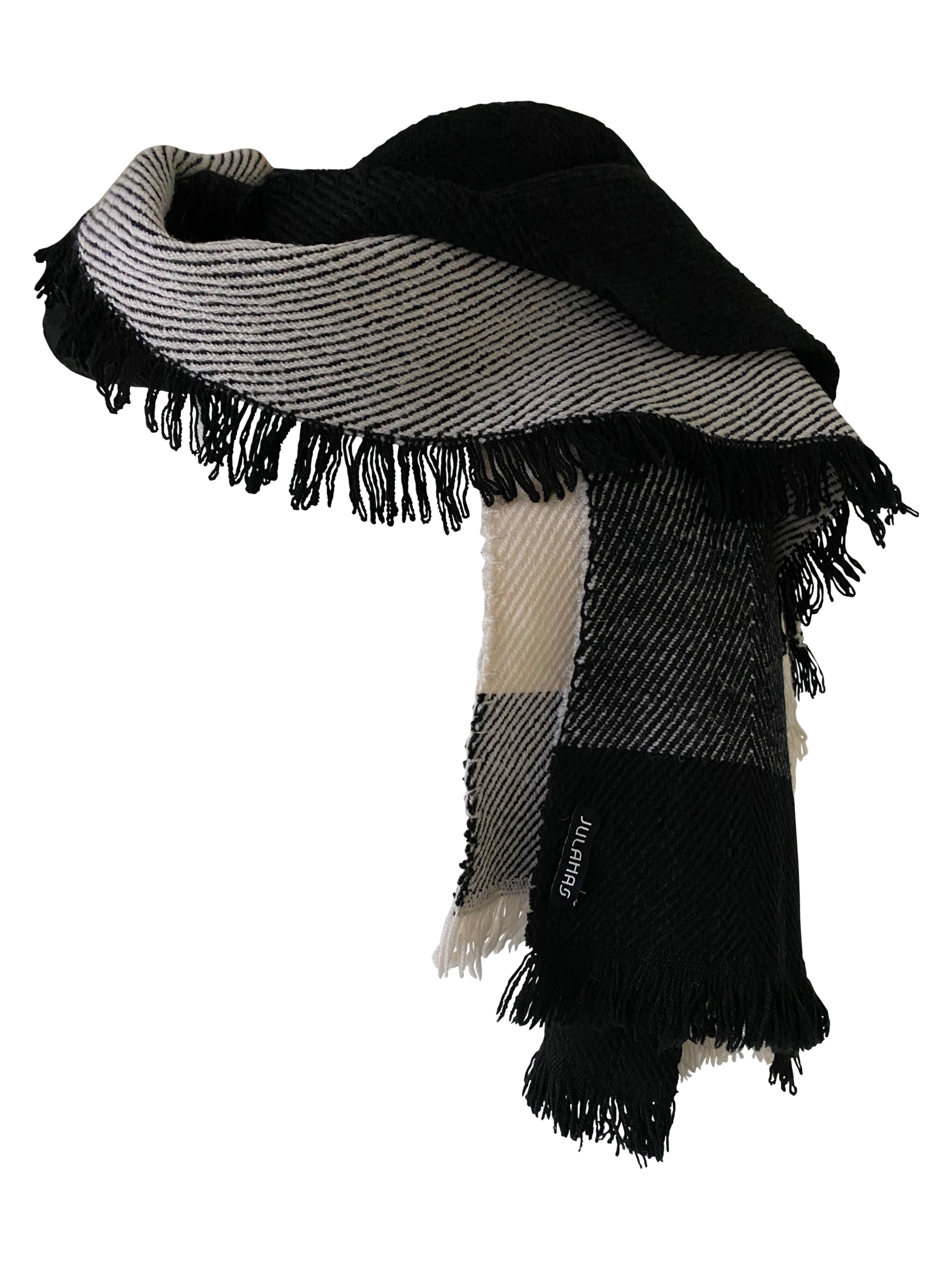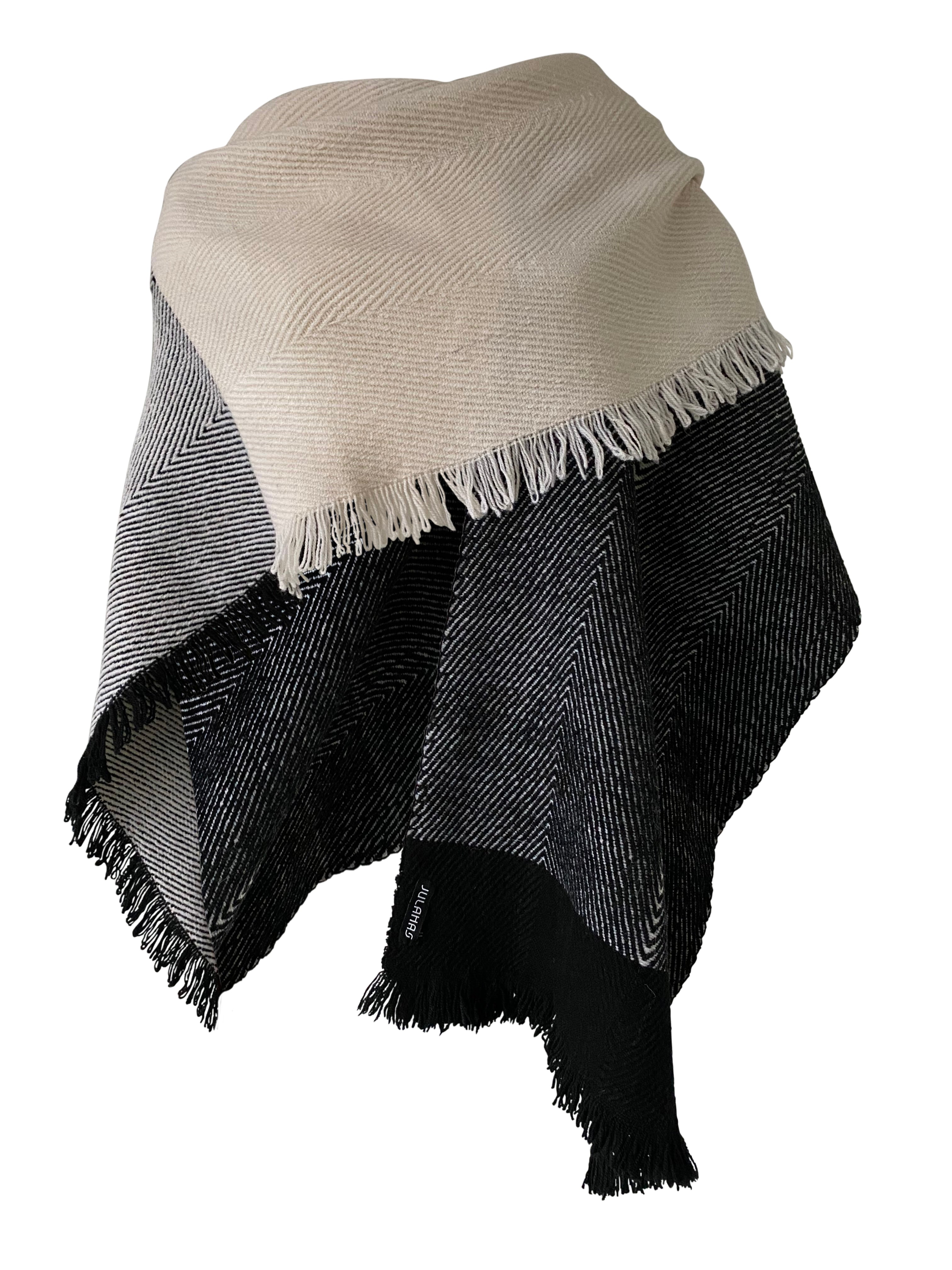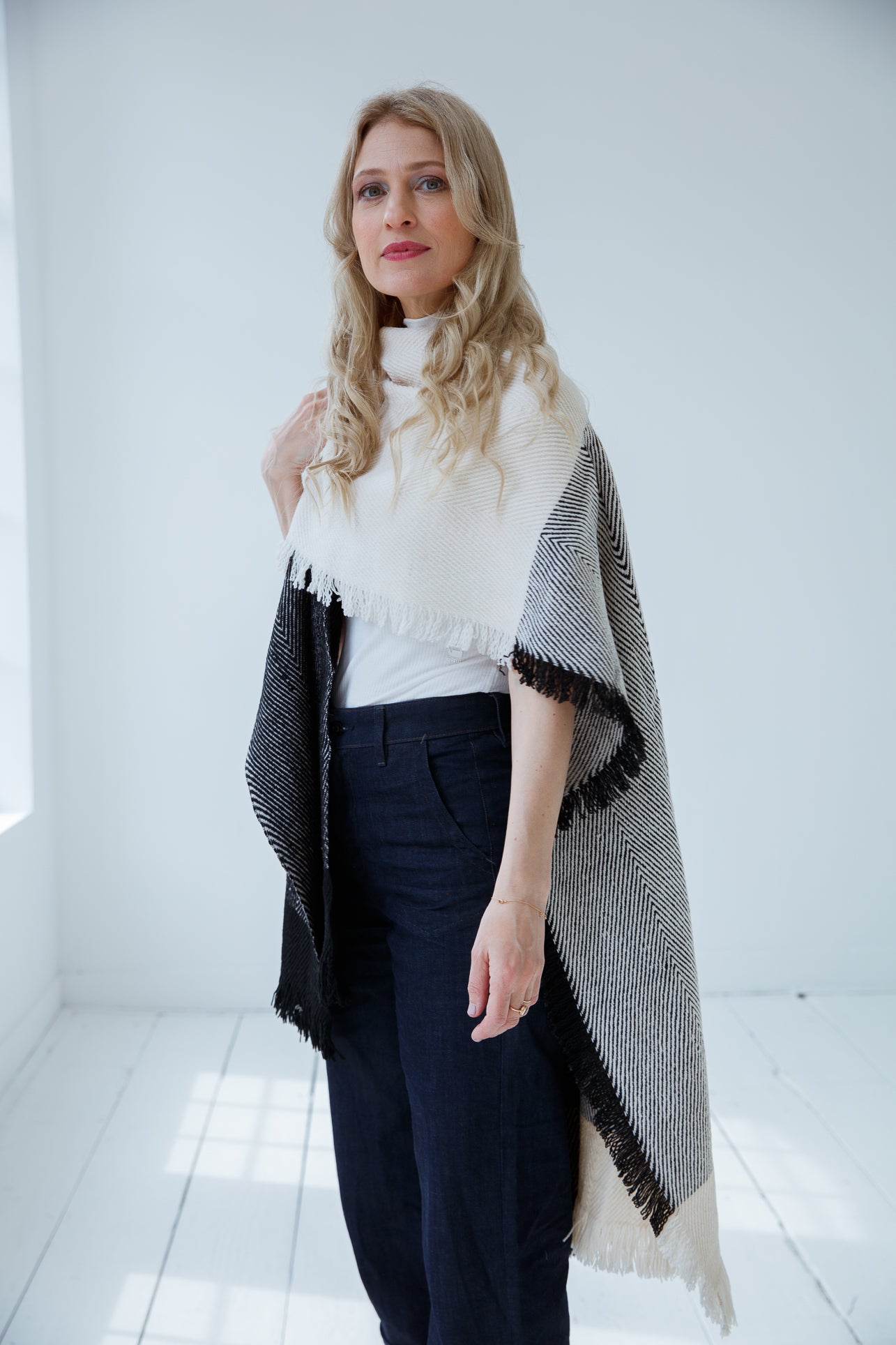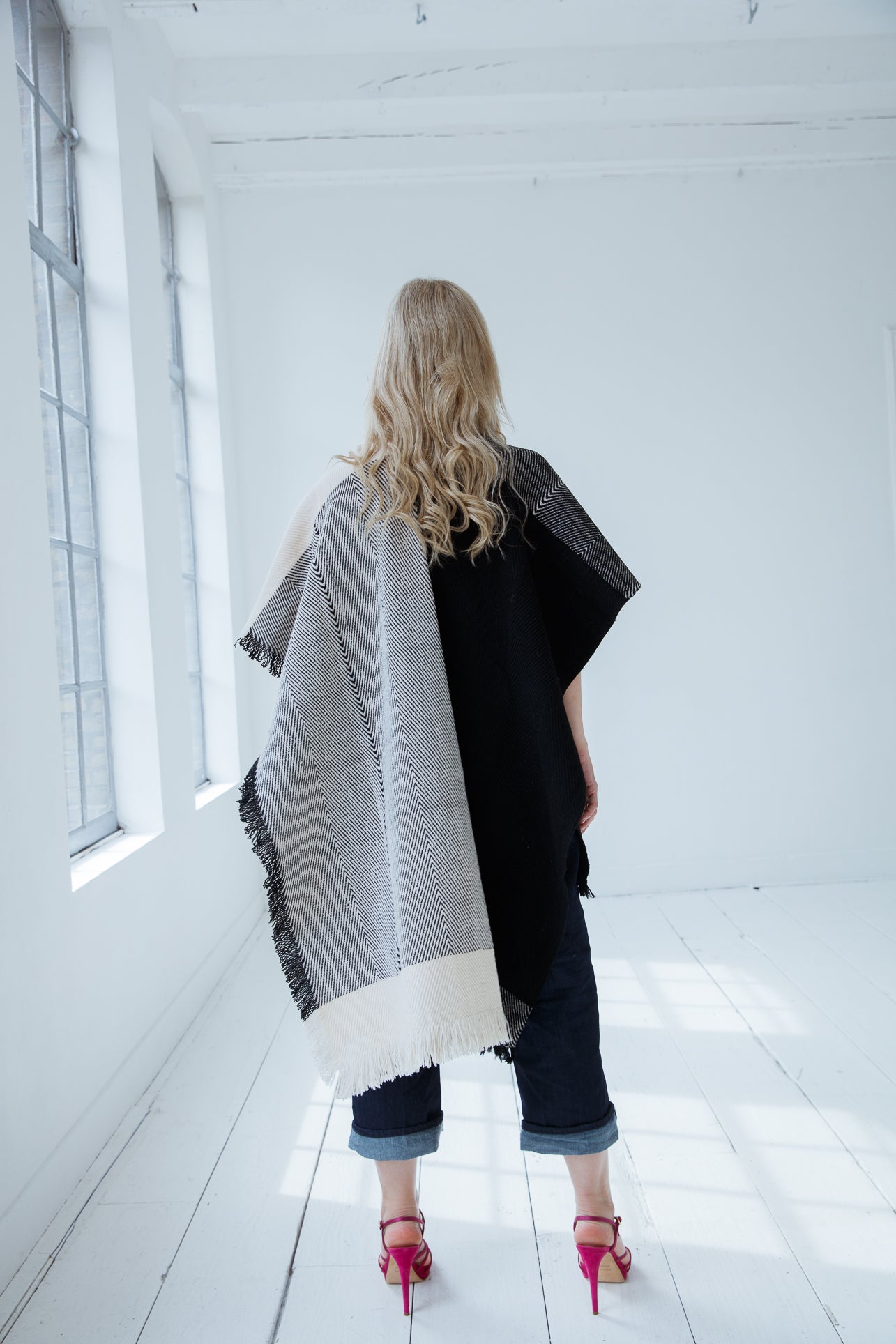 Add cozy elegance and a touch of luxury to your favourite dress or top with our chunky wool Ruana Beyond black and white that weighs approximately 1 kg. Open in the front for easy wearing and ideal for plus or petite sizes, this ultra stylish Ruana  looks like a wrap but feels like a blanket. Throw on this extra layer and style it in a number of different ways -- casual when you’re at home or stylish when you step outside.