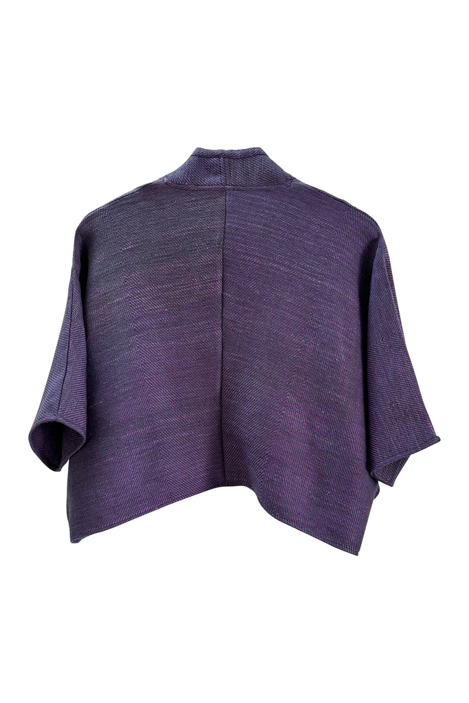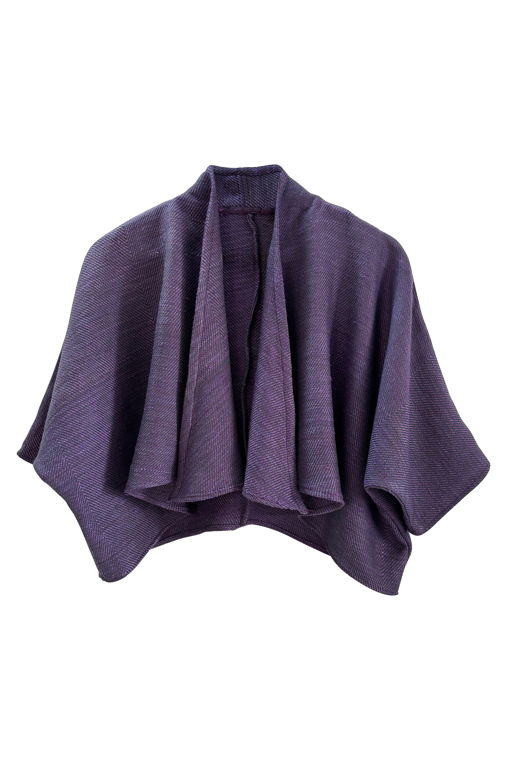 The WOOL SILK WATERFALL BOLERO PURPLE is a timeless piece with a cascading waterfall front and elegant elbow-length sleeves. Its rich purple shade adds a regal touch, while the soft wool-silk blend ensures comfort and sophistication.